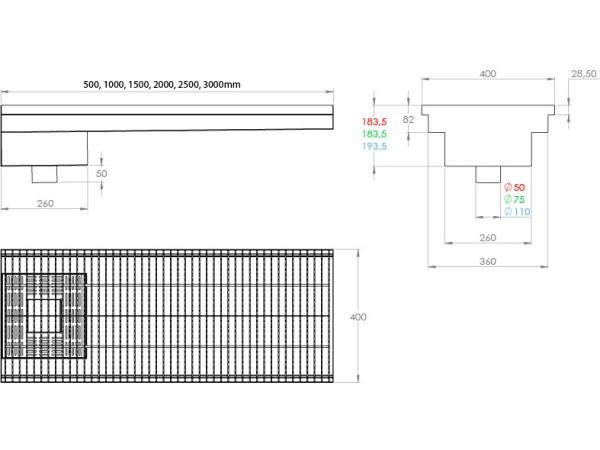 Inoks podna rešetka s koritom i sifonom,400 x 2000 x Ø50/ Ø75 / Ø110mm