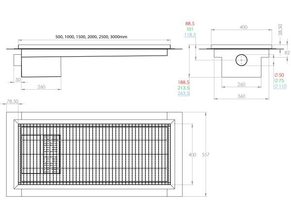 Rešetka od nehrđajućeg čelika AISI 304 pogodna za prelazak osobnim vozilom s koritom, sifonom i mrežicom za lovljenje grubih čestica.