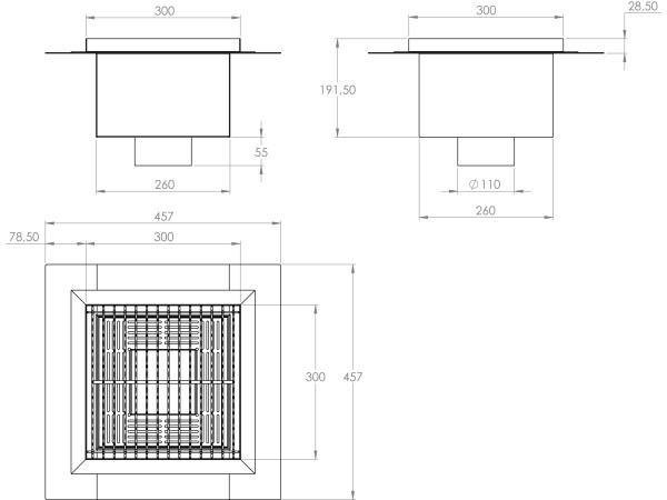 Inoks podni sifon s rešetkom dimenzija 300mm x 300mm x 191mm Ø110mm