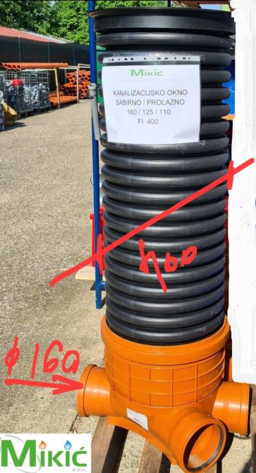 UKC sabirno okno promjera 400mm. Sabirno okno ima 1 izlaz i 3 izlaza fi 160 koji se mogu redukcijama reducirati na 125, 110, 75 prema potrebi.