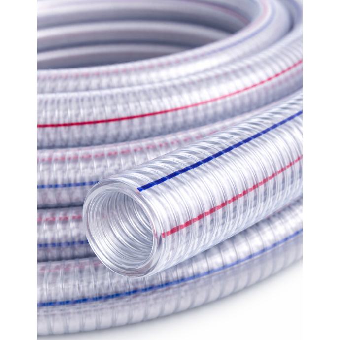 Crijevo je izrađeno od visokokvalitetnog PVC-a, što osigurava dug vijek trajanja i otpornost na vremenske uvjete i mehanička oštećenja. Njegova debela stijenka od 2 mm povećava otpornost na habanje, dok glatka unutarnja površina poboljšava protok. Korištenje vrlo fleksibilnog PVC-a i izdržljive, tvrde plastične spirale omogućuje visoku fleksibilnost uz smanjenje težine crijeva.