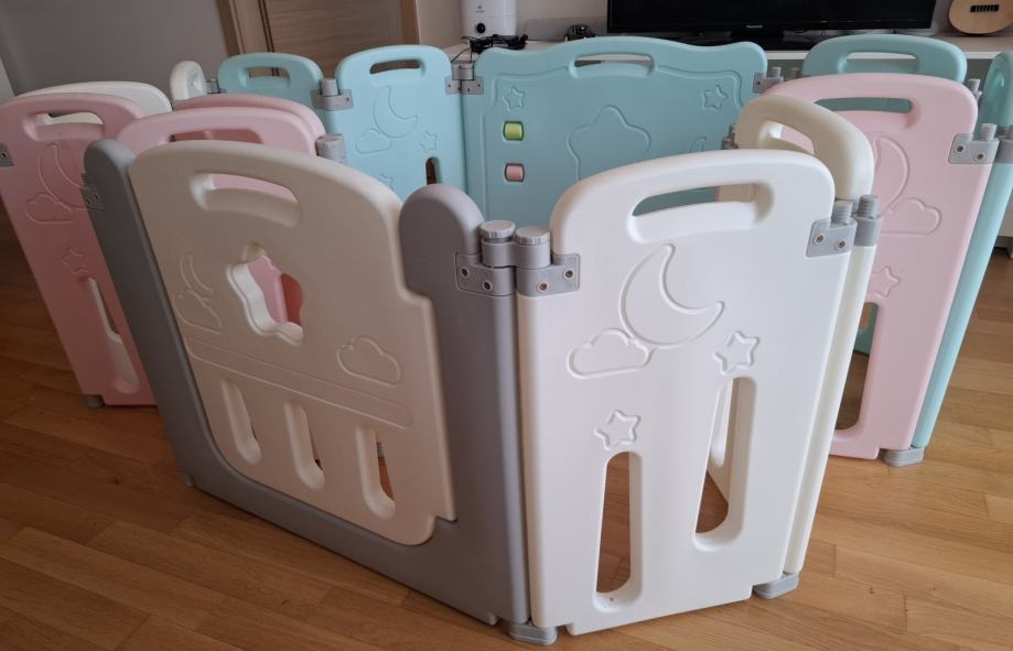 Prodajem očuvanu modularnu ogradicu za djecu u nježnim pastelnim bojama. Idealno za stvaranje sigurnog prostora za igru.