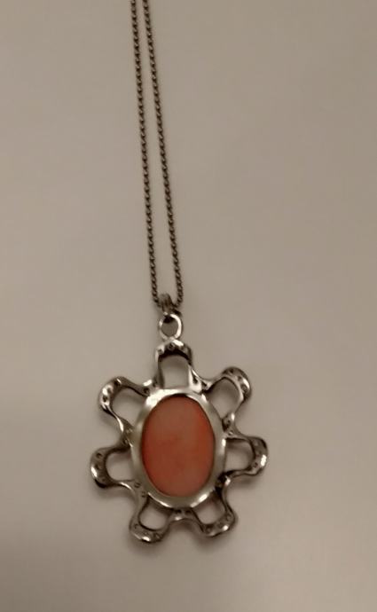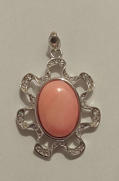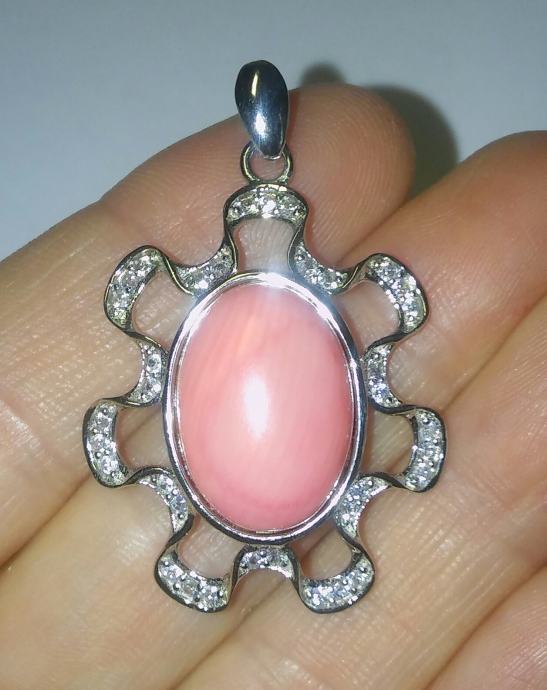Potpuno novi 925 srebrni privjesak, rodiniran, što znači da ima obradu kao bijelo zlato. Privjesak je s rozim koraljem, a uokolo su sitni cirkoni.