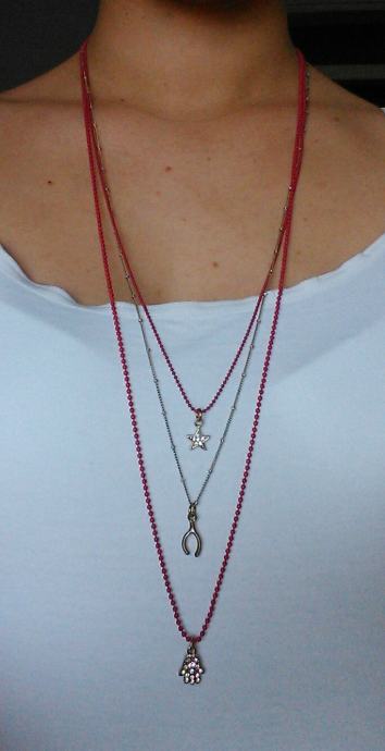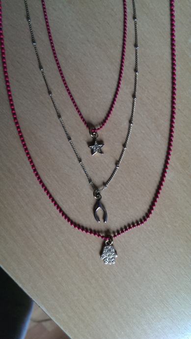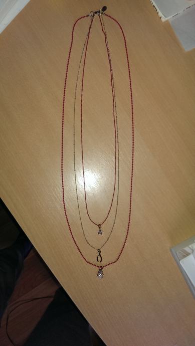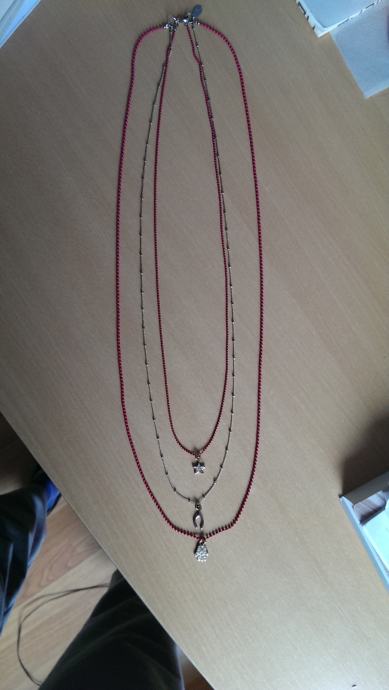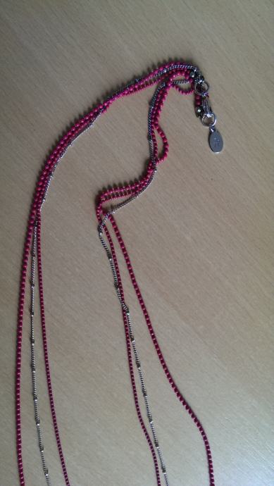 Zanimljiva accessorize ogrlica iz 3 lanca, 2 roza kuglice, jedan zlatni, sa 3 različita privjeska. Nešto duža, nošena par puta, očuvana
