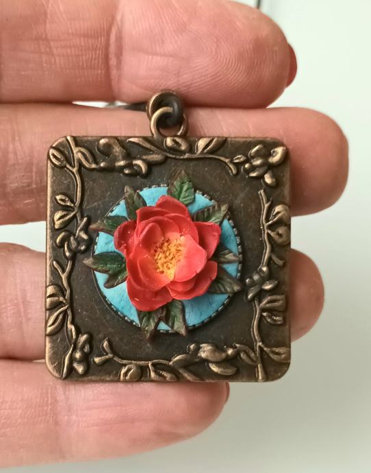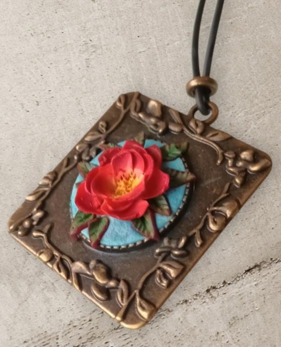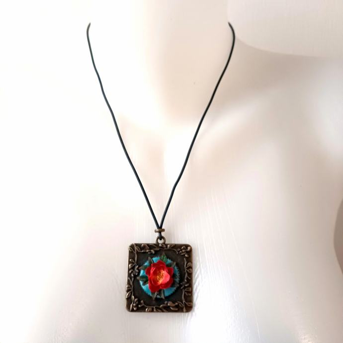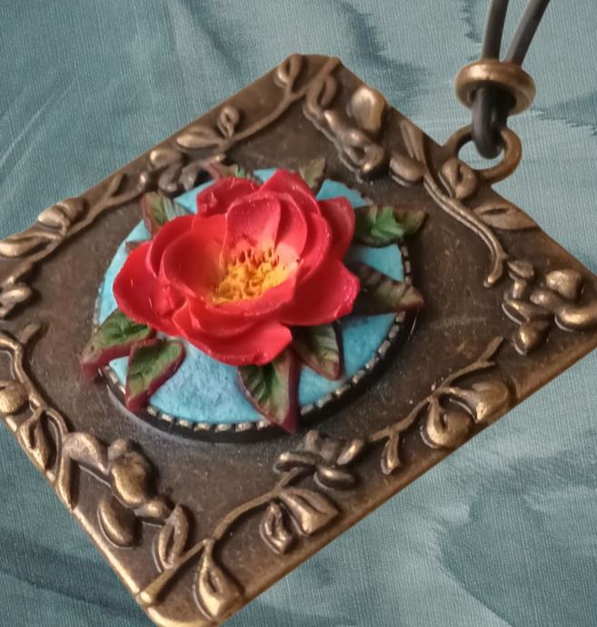 Art romantična ogrlica s motivom minijaturne crvene rascvjetale ružice, ručno rađene, svaka latica i listići, od polimerne gline, položene na tirkiznu podlogu. Cijeli minijaturni dizajn zapečen je na kvadratnu gotovu mesing podlogu dimenzije 4x4 cm te postavljenu na crnu silikonsku ogruglu trakicu dugu do 45 cm. Unikat. Ručni rad.