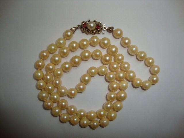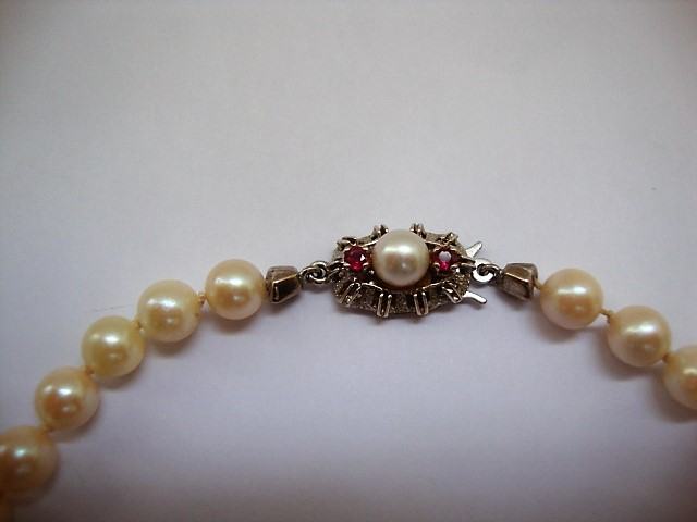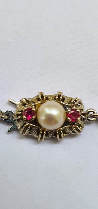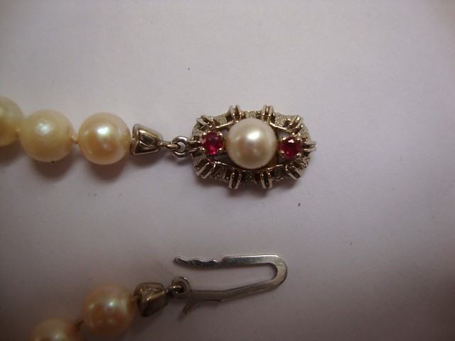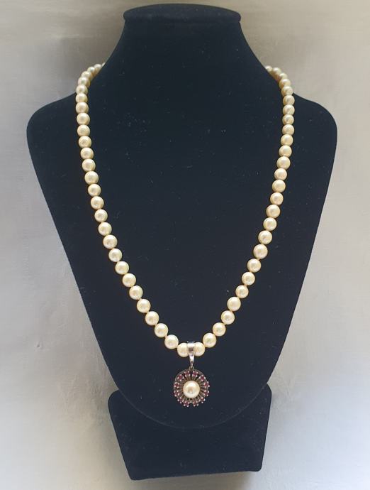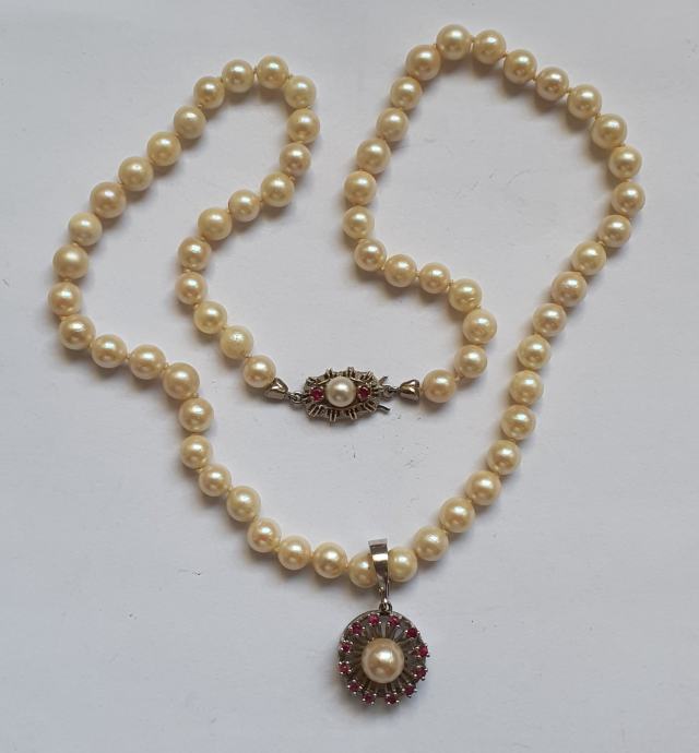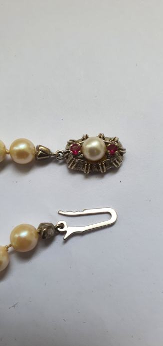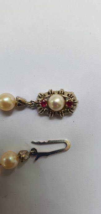 Krasna elegantna biserna ogrlica ukrasna zlatna kopća od bijelog zlata ukrašena rubinima