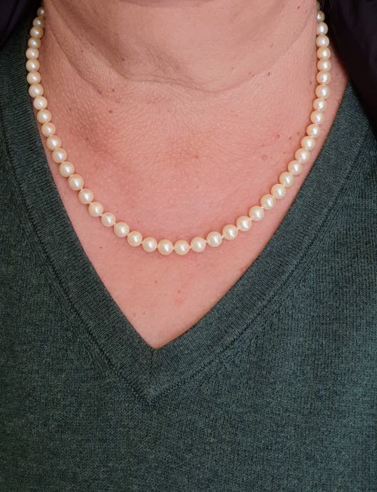 Ukupna dužina 46,5 cm promjer biserna je 7 mm pravi prirodni biser sedefastog sjaja