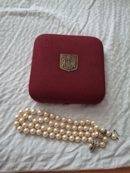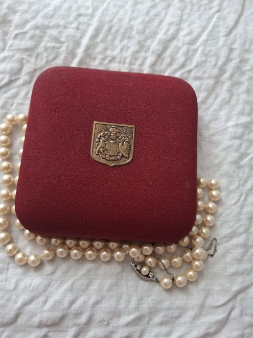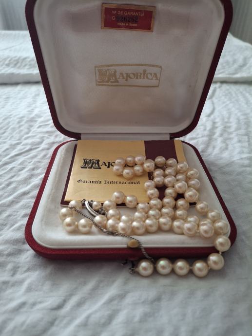 Originalna Majorica biserna ogrlica u originalnom pakiranju-kutija od baršuna. Kopča je srebrna ali u materijalima se ta opcija ne navodi.