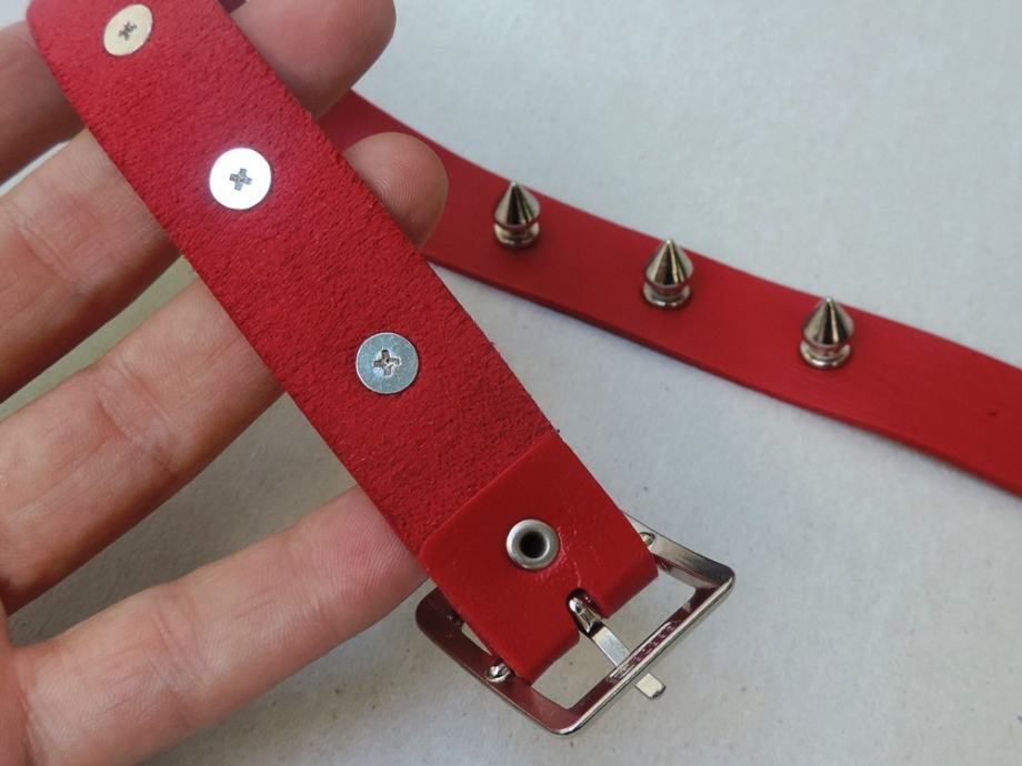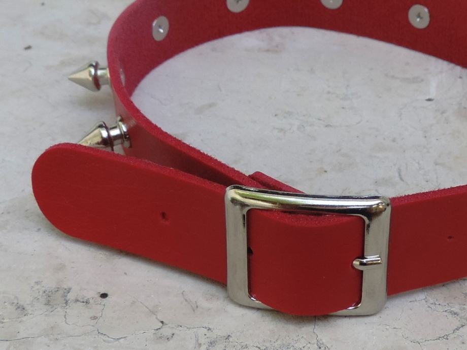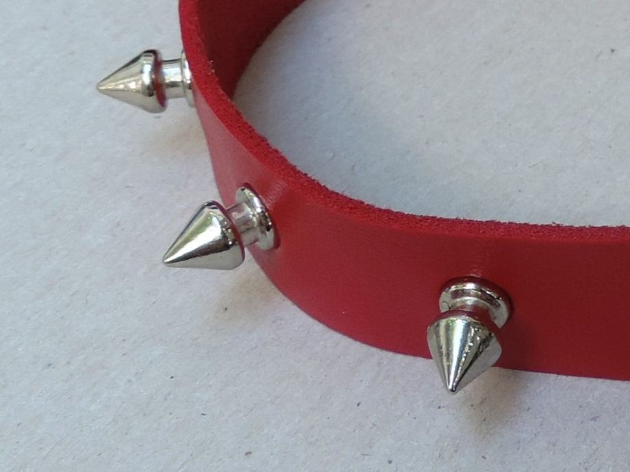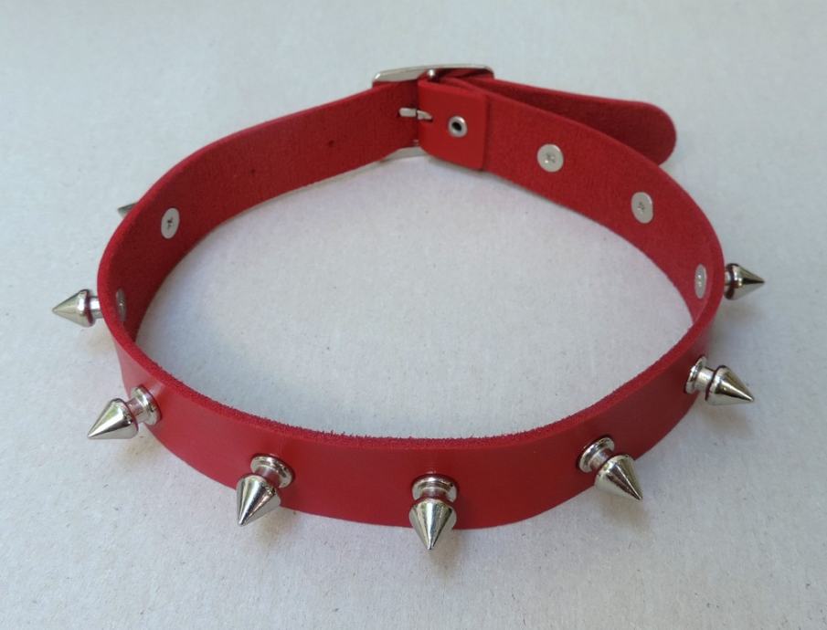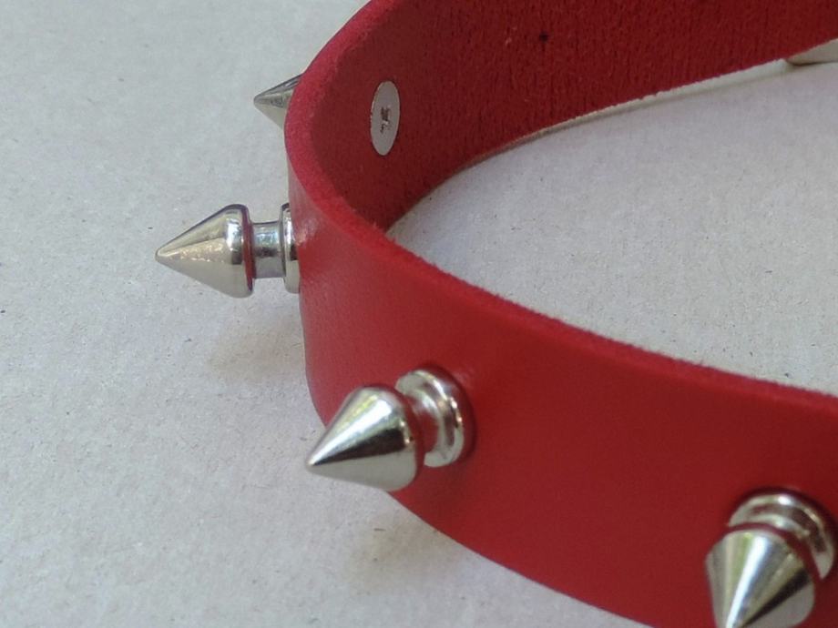 Odličan crveni spike choker od imitacije kože s 10 srebrnih šiljaka.