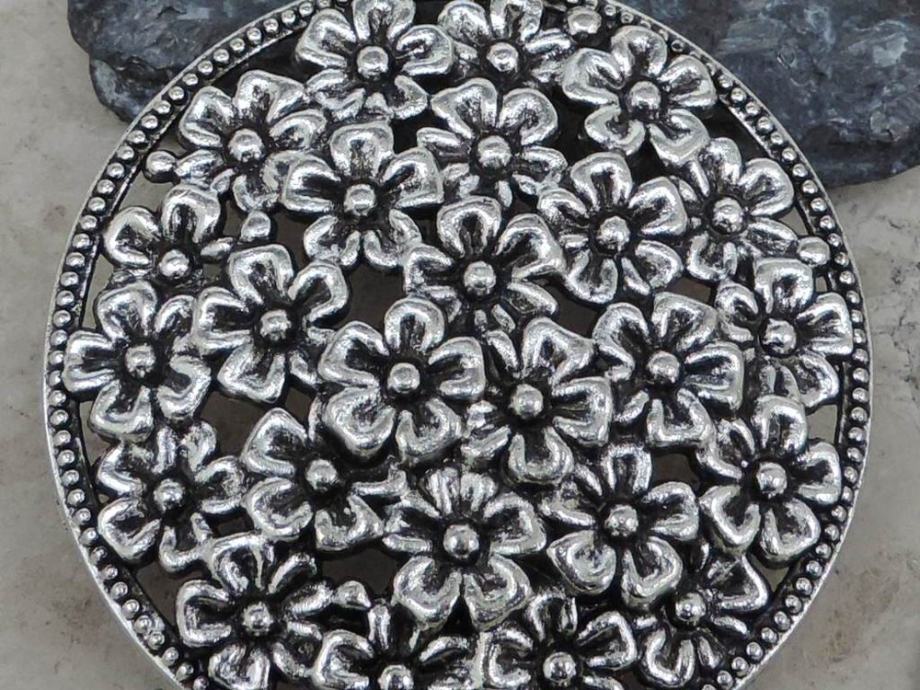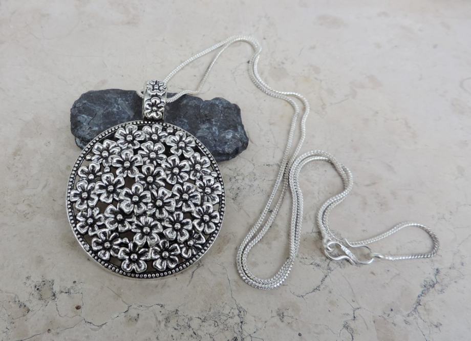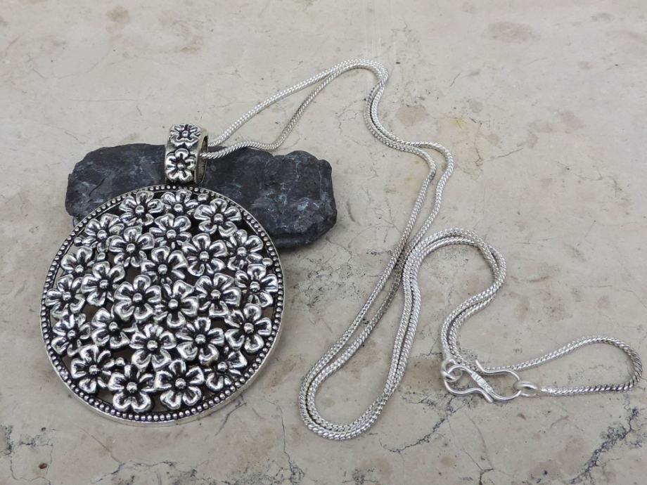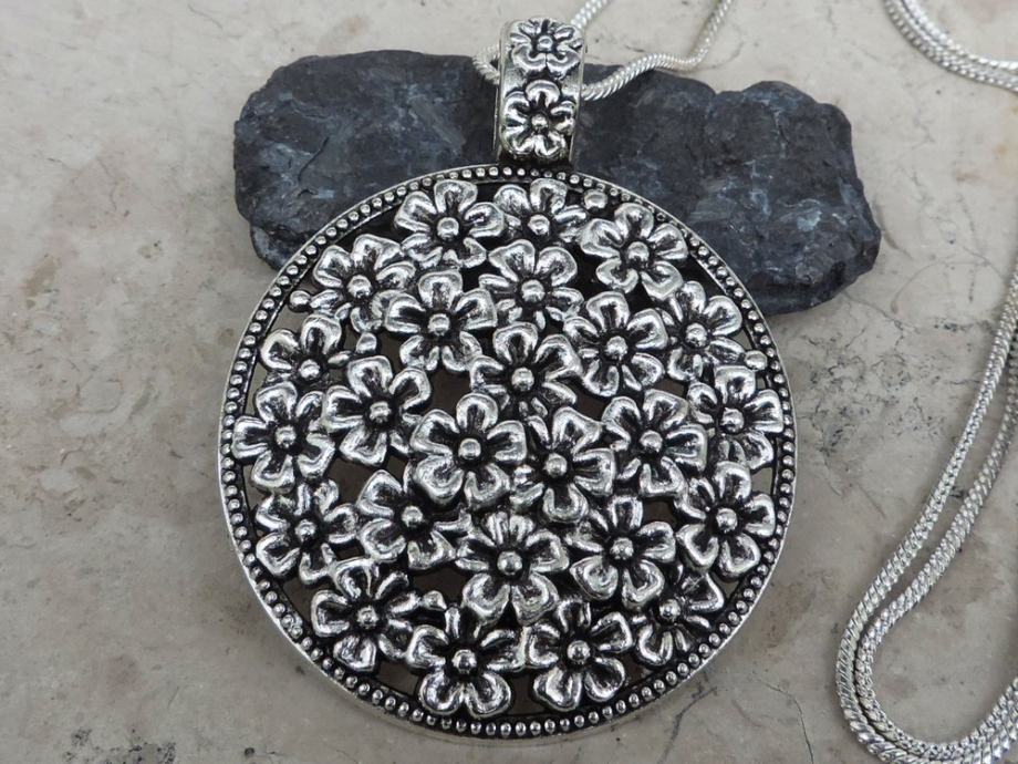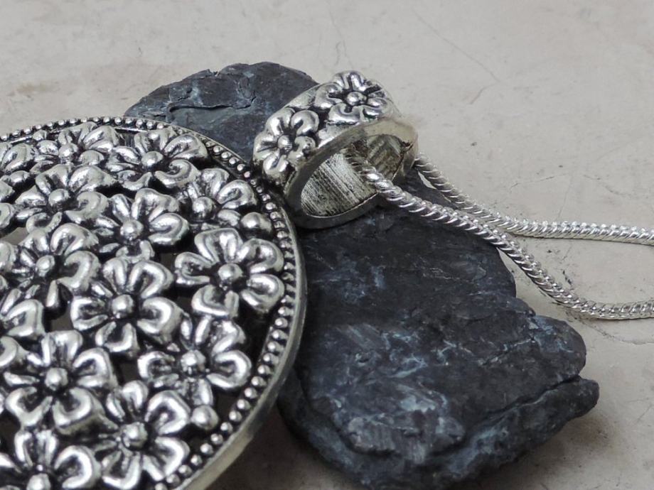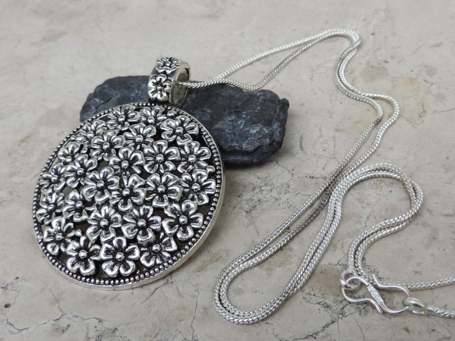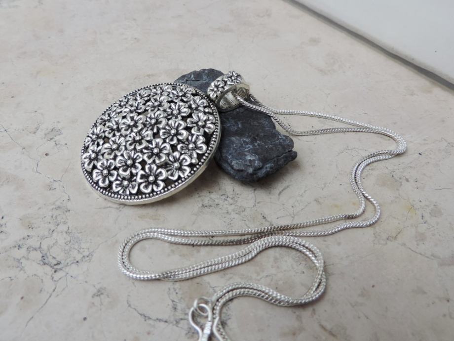 Bogati privjesak ukrašen sitnim cvjetićima u vintage stilu, s pripadajućim lancem.