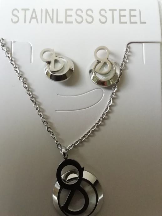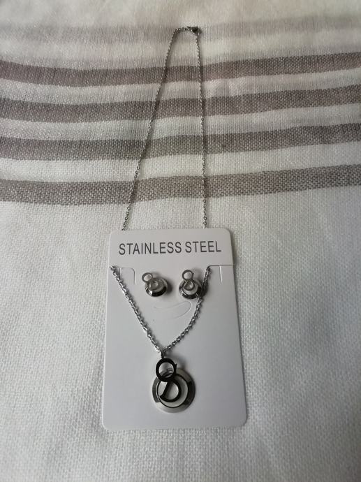 Nova, nikad nošena ogrlica, duljina lančića 25cm. Kirurški čelik. Uz nju u kompletu dolaze naušnice. Cijena kompleta je 28 EUR. Primopredaja Zagreb zapadni dio grada ili Centar. Šaljem i poštom ili Tiskom.