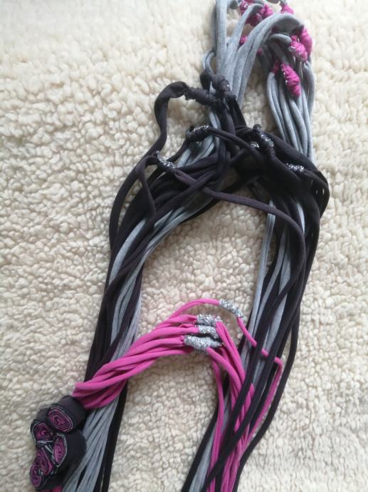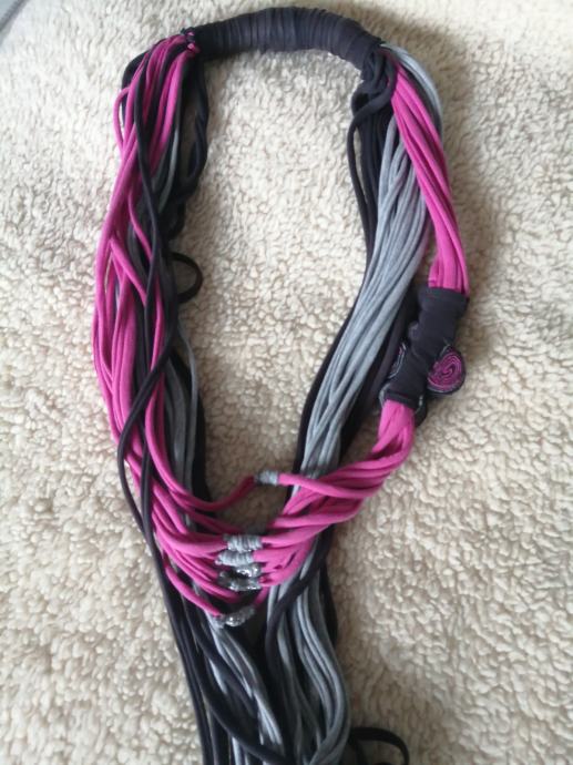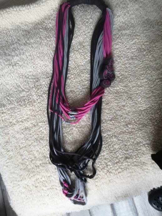 Prekrasna duga ogrlica crne, sive i ružičaste boje. Puno, punoooo pamučnih trakica te se može različito nositi. Duljina 79 cm.