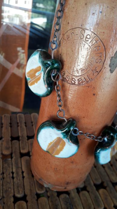 Umjetnički rad, keramička ogrlica na bakrenom lančiću. Rad zagrebačkog umjetnika, kraća, efektna, raskošna. Promjer-dužina 30 cm, širina keramičkih privjesaka 3,5, visina 4 cm