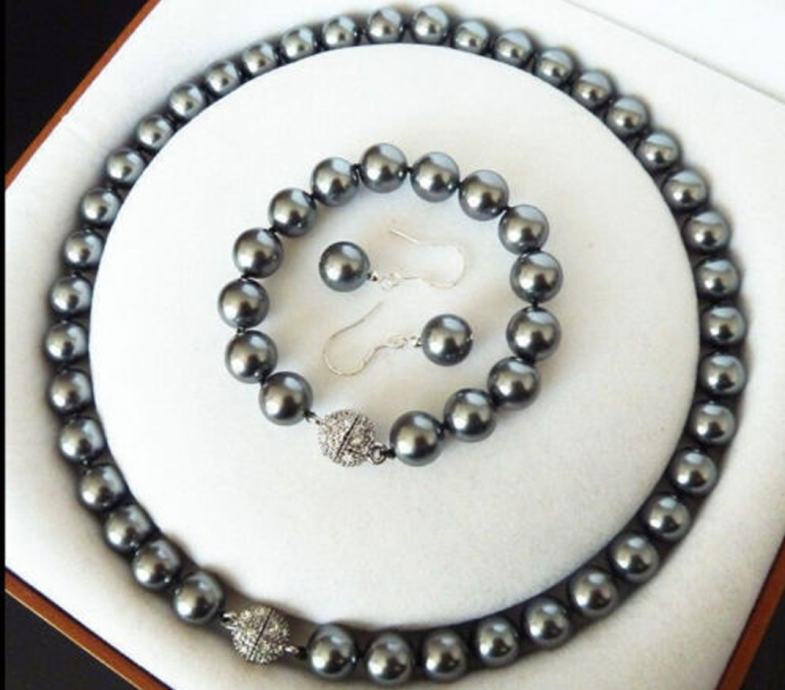 Sa slike, komplet: biserna ogrlica, naušnice i narukvica, crni pravi morski biseri 8mm.