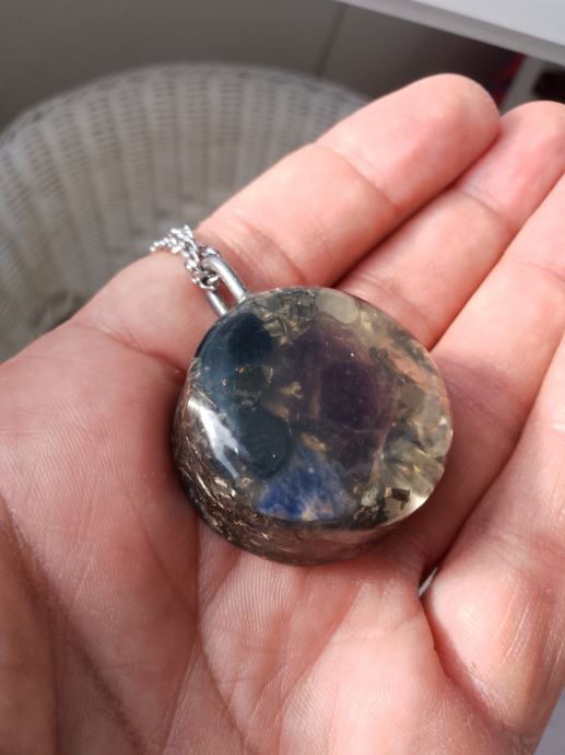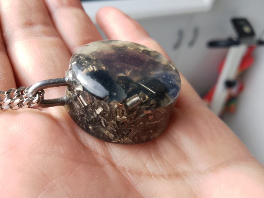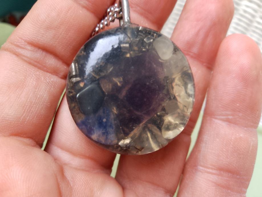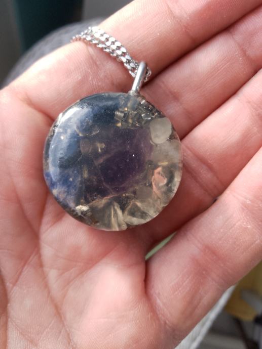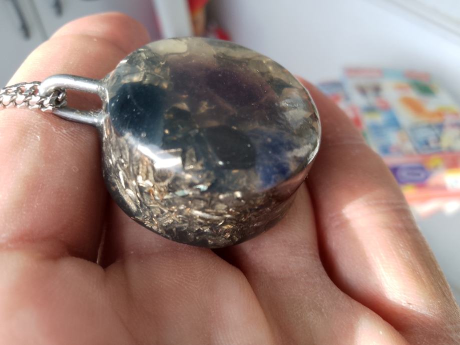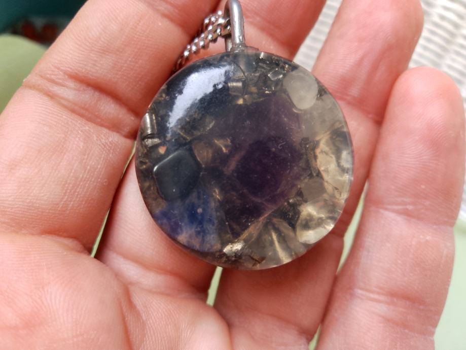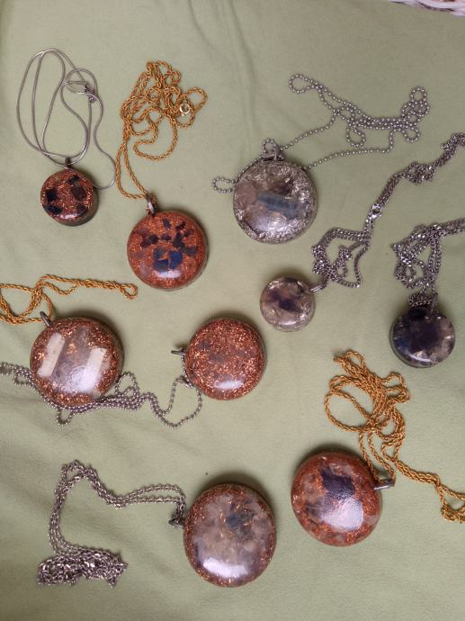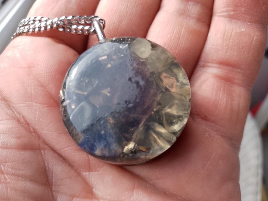 Orgonit u kompletu s lančićem iz moje kolekcije UNIKATNIH (svaki je poseban i drugačiji od ostalih) orgonita koji obiluju PRIRODNIM kristalima i metalom (bez dovoljno metala orgonit nije funkcionalan u odbrani i poništavanju EMF zračenja). Uglavnom su korišteni bakar i aluminij kao dva najbolja metala za orgonite.