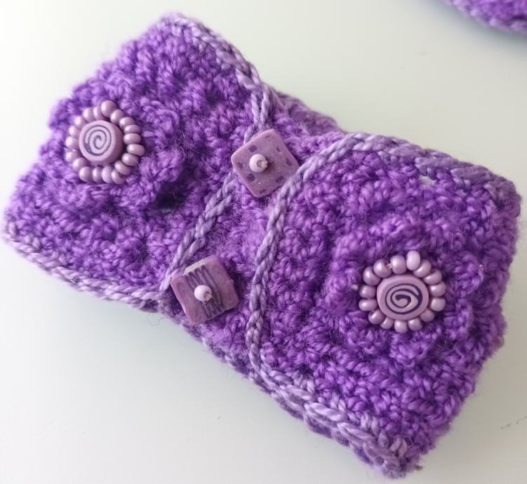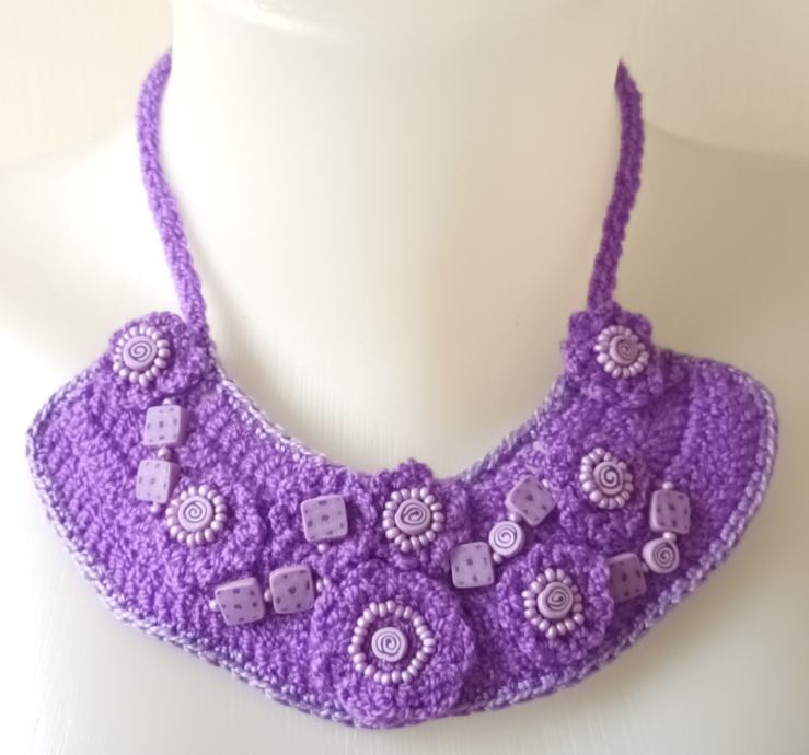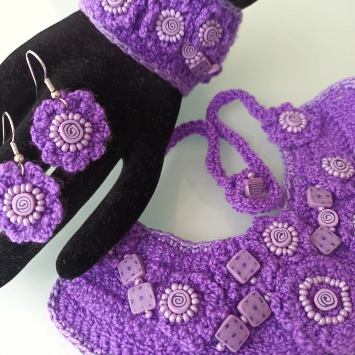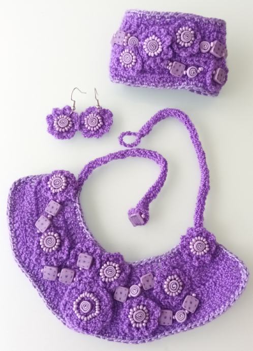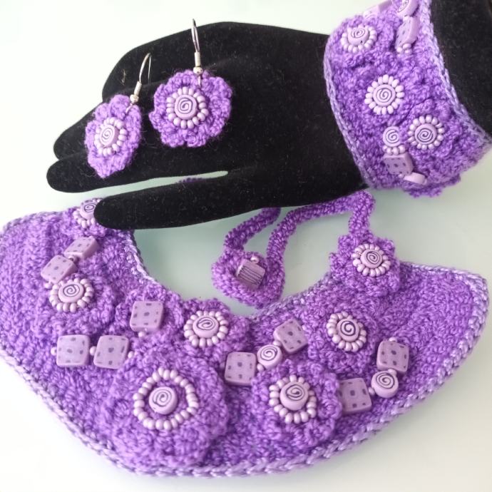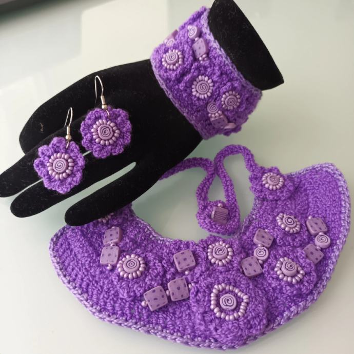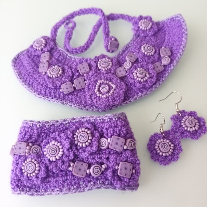Heklani kompletic:ogrlica, naušnice i narukvica. Ručni rad. Ukrasen ručno rađenih perlicama od polimerne gline i sitnim staklenim perlicama.UNikat.
