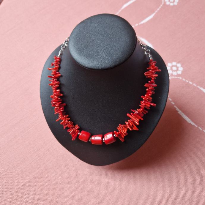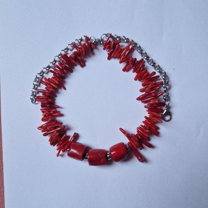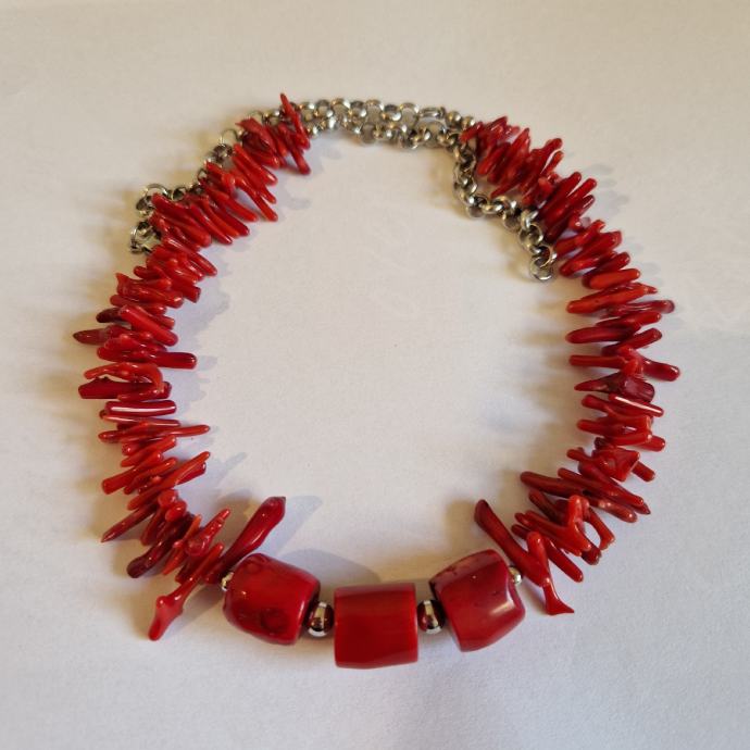Koraljna ogrlica je ručni rad,unikat.Središnje tri perle su veličine cca 15×10mm.Svi metalni dijelovi su čelik u boji srebra .Duljina ogrlice je podesiva, maksimalno 57cm.