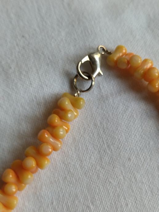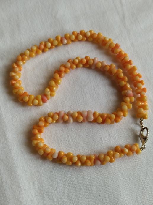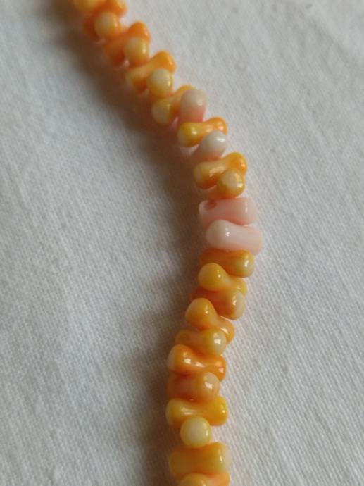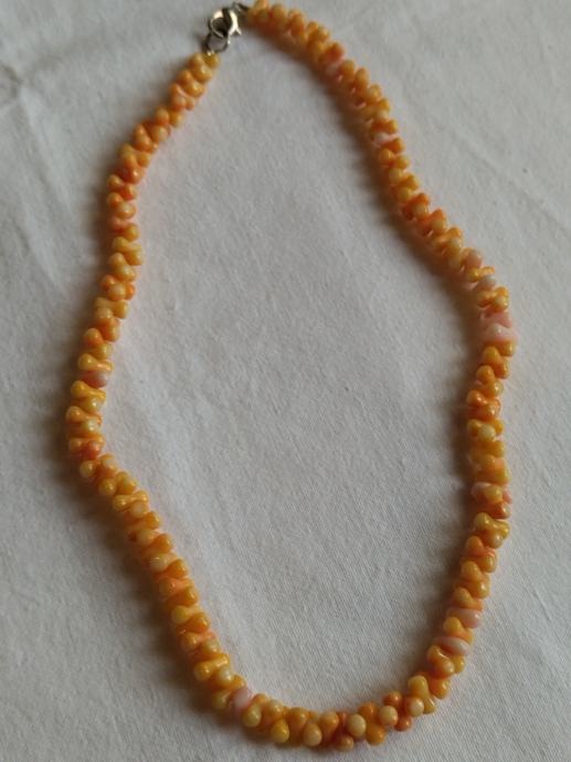 Koraljna ogrlica vrlo lijepe bijelo-ružičaste boje. Nizana od jednako oblikovanih duguljastih oblika.