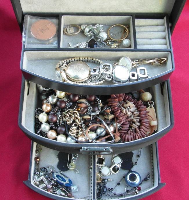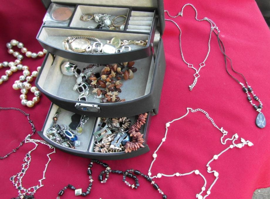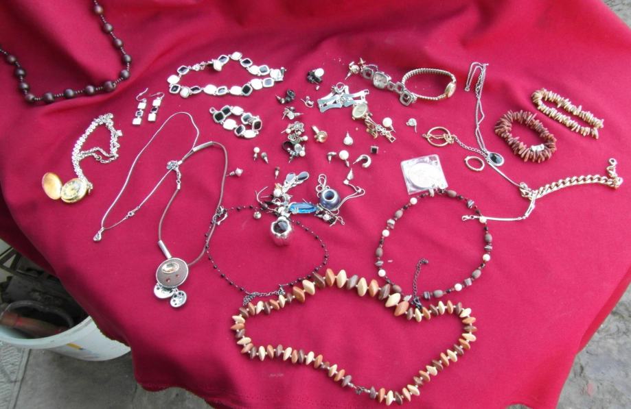 Nakit je koliko znam nekorišten. Ima 20-ak lančića iliti ogrlica,20- ak naušnica , 4-5 satova, 4-5 narukvica, par prstena. Uglavnom sve vidljivo na slikama, mada je uživo sve još bolje. U lot je uključen i kovčeg. Nema srebra i zlata.