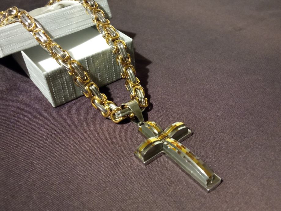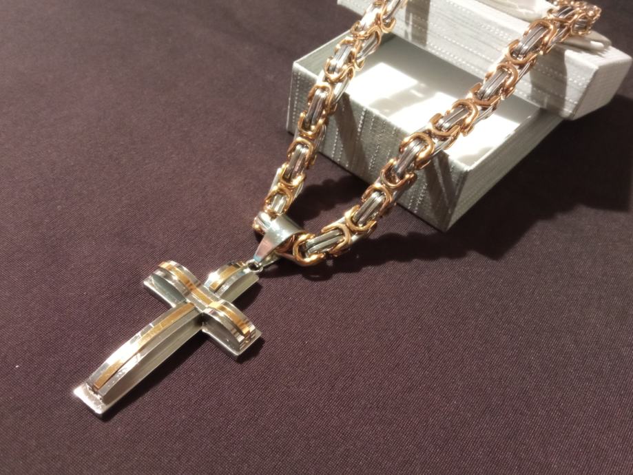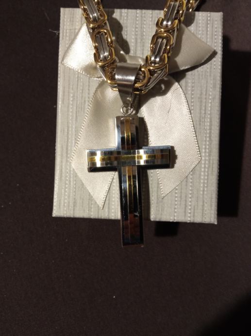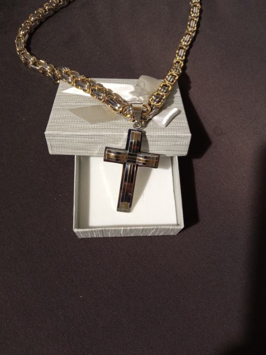 Lančić kirurški čelik kraljevski vez 9 mm sa djelomičnom pozlatom i križ kir.čelik sa pozlatom