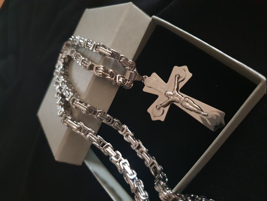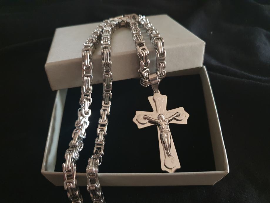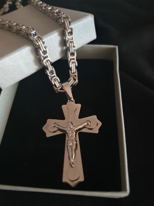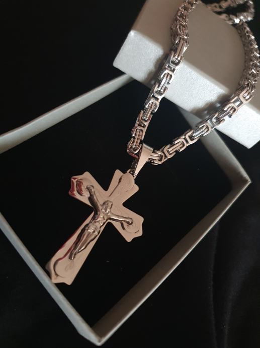 Lančić kirurški čelik kraljevski vez širine 5 mm i privjesak križ kirurški čelik, u boji čelika