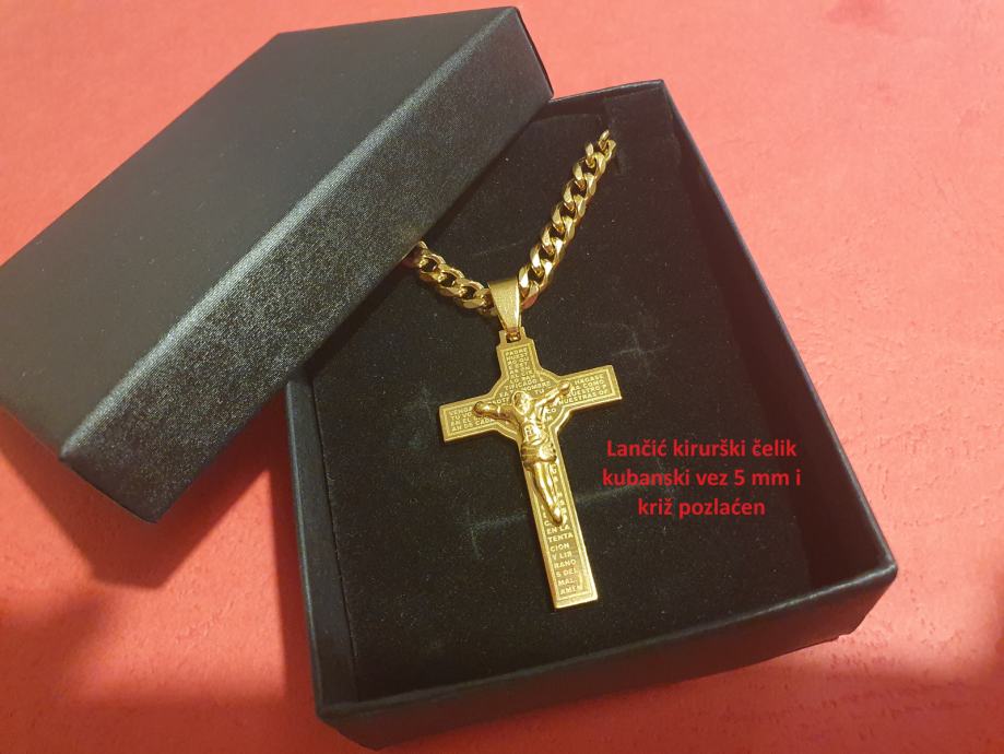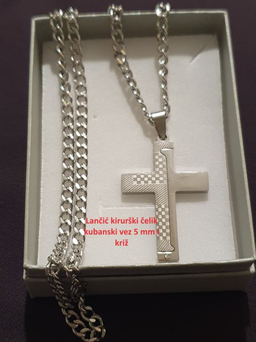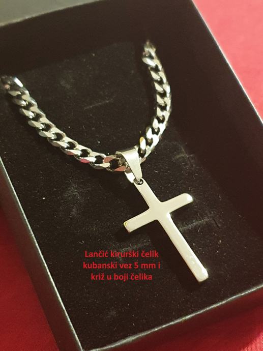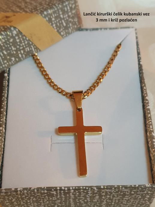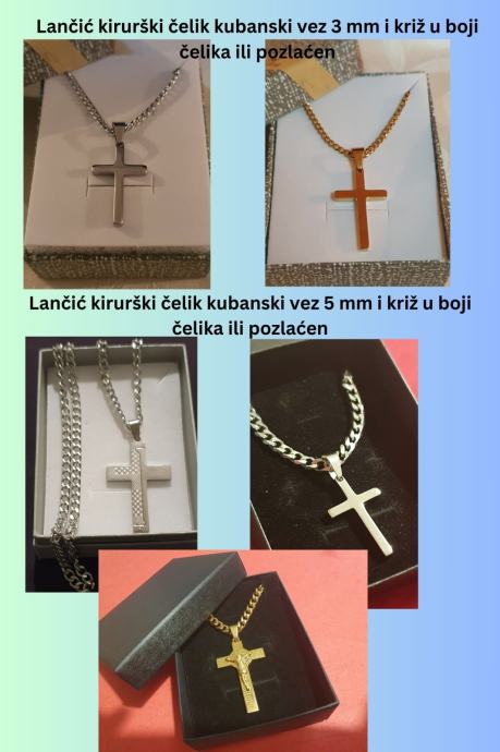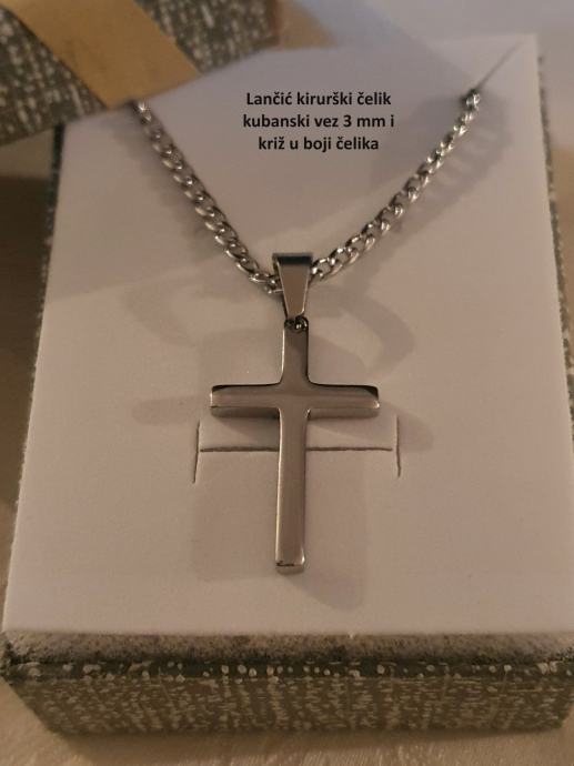 Lančić kirurški čelik kubanski vez 3 mm ili 5 mm i privjesak križ kirurški čelik u boji čelika ili pozlaćen