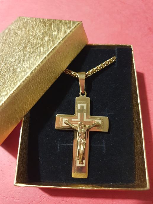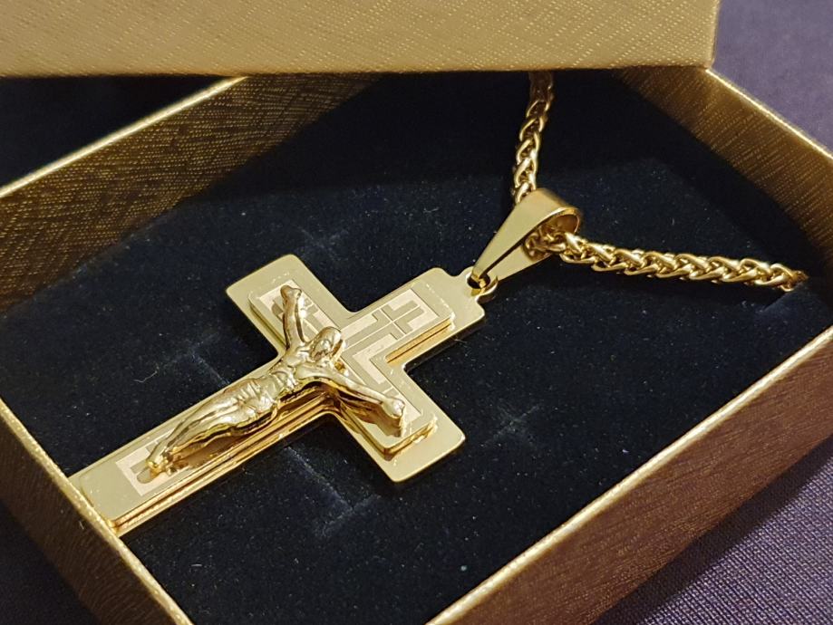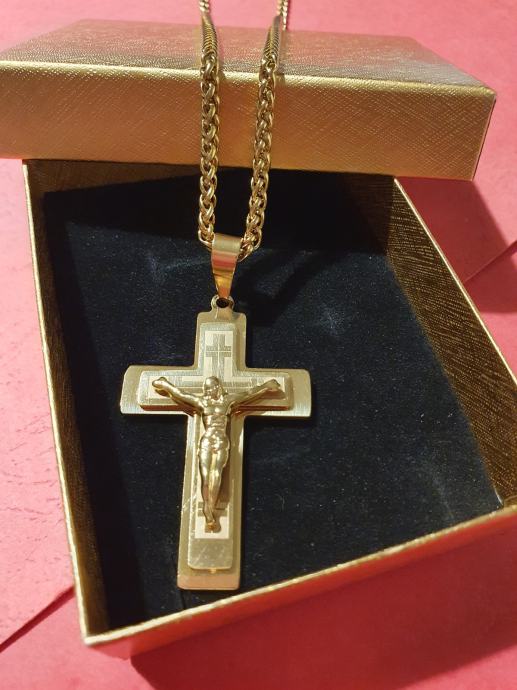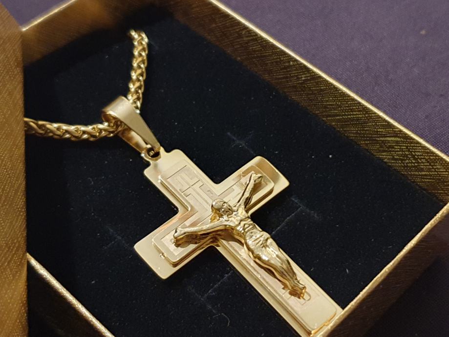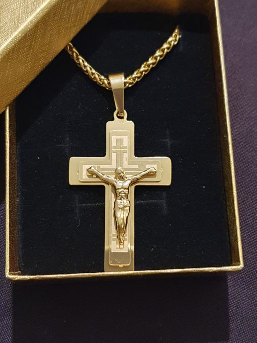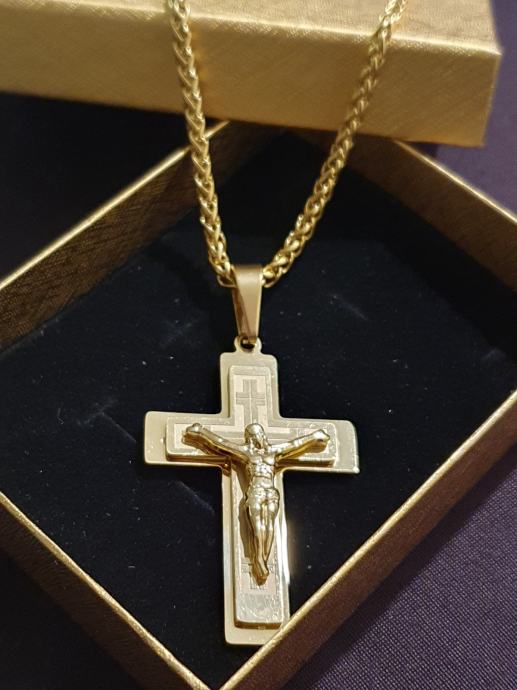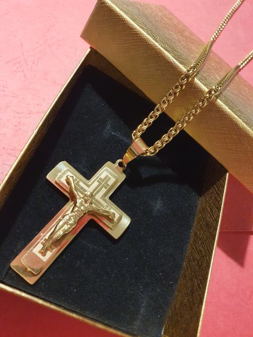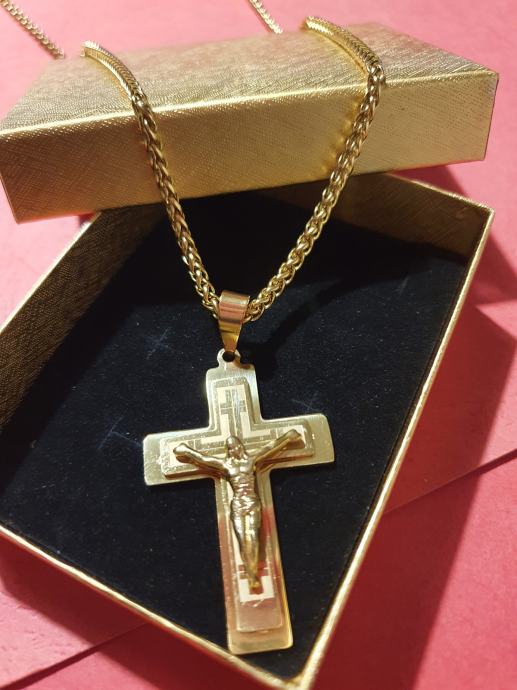 Lančić kirurški čelik pletenica cijela pozlaćena širine 3 mm i križ kirurški čelik pozlaćeni