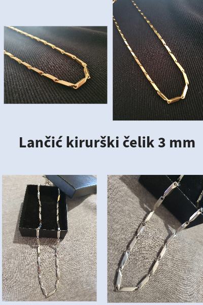 Lančić ne reagira na kiselost kože, ne mijenja izgled (ne tamni), može se nositi u bazene, more, tijekom tuširanja i spavanja, izrazito čvrst materijal koji se ne može lako potrgati, vrlo efektnog izgleda, prikladan za žene i muškarce