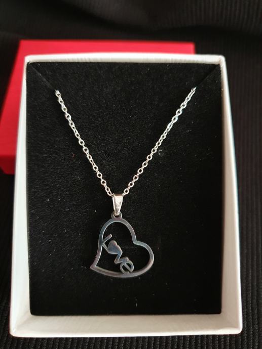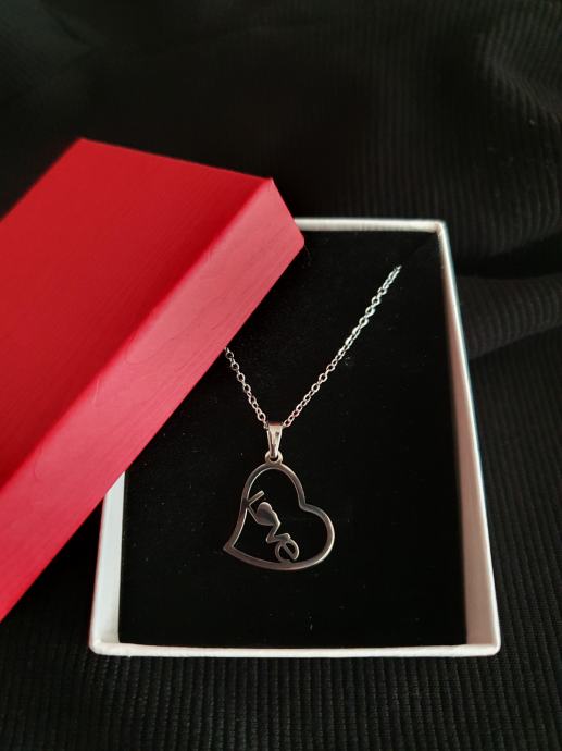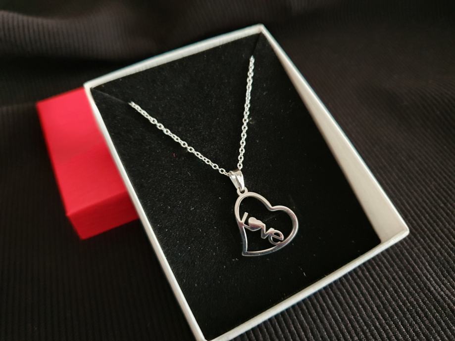Lančić kirurški čelik u obliku srca s natpisom Love dužine 45 cm (mogućnost i dužine 50 cm i 60 cm), veličina privjeska 2 cm x 2 cm