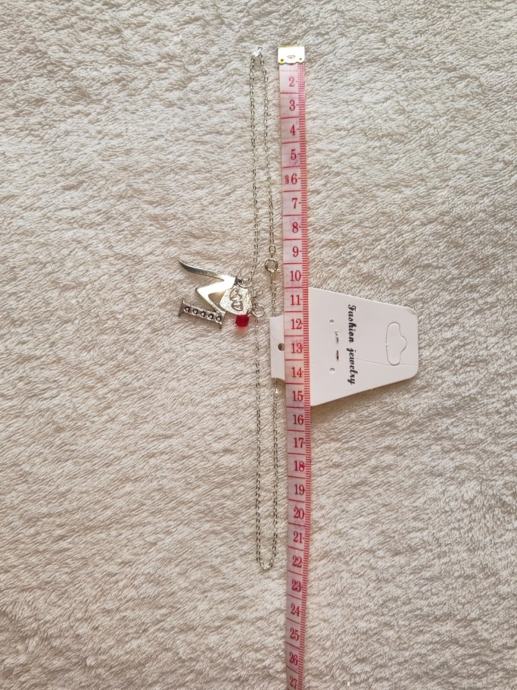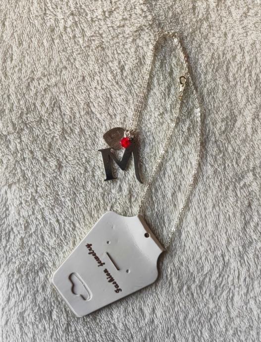 Lančić je lagan i napravljen u obliku slova M sa srcem i crvenom kamenom od plastike