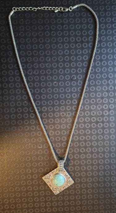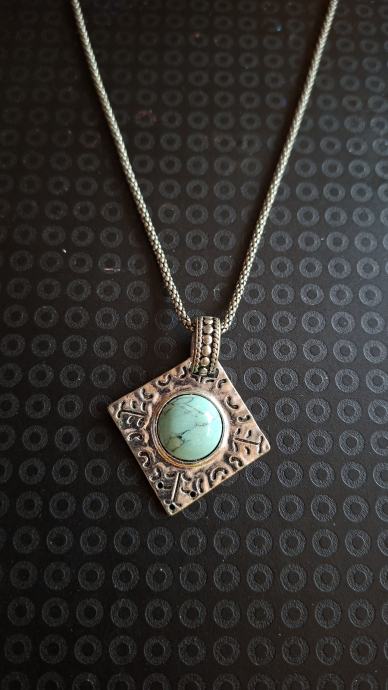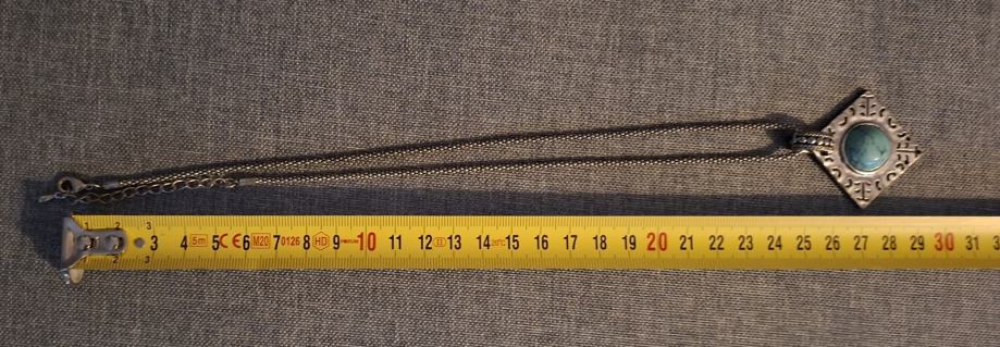 Prodajem lančić s atraktivnim medaljonom u obliku romba s tirkiznim kamenom u sredini. Medaljon ima dekorativni uzorak urezanih detalja koji daju vintage izgled cijelom komadu. Srebrna ogrlica je dobro očuvana i ima klasičnu kopču koja omogućuje lako stavljanje i skidanje.