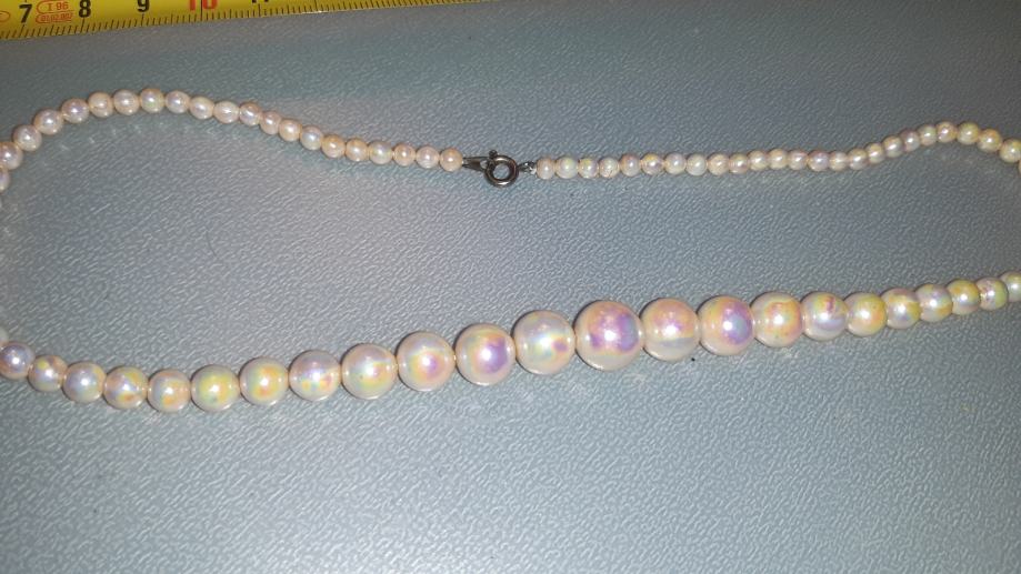 Elegantna ogrlica dužine 45 cm, nikad nošena i u savršenom stanju. Izrađena od kvalitetne bižuterije s lijepim bisernim perlama koje se nježno prelijevaju u svjetlucavim tonovima.
