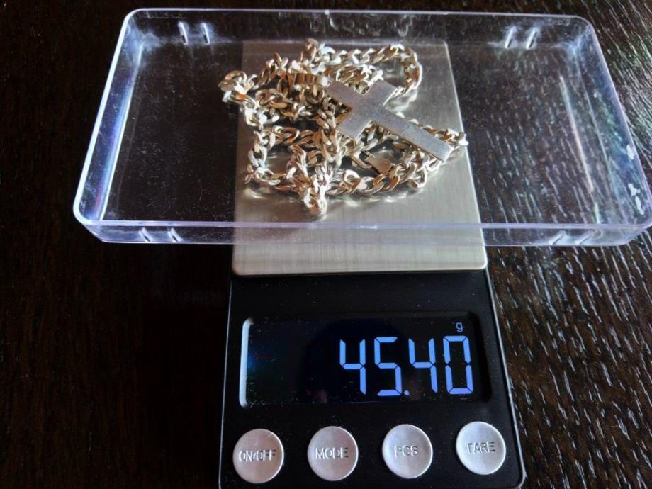 Lanac i križ su nošeni, ali nemaju oštećenja (imaju nekih sitnih tragova korištenja, praktički neprimjetno, što se da uglačati kod zlatara za nisku cijenu, ako baš želite da izgleda kao potpuno nov).