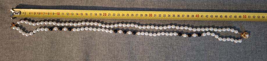 Elegantna ogrlica u bijelo-crno-zlatnoj kombinaciji s ukrasnom kopčom i dvostrukim nizom bisera. Kombinacija bijelih bisera s crnim i zlatnim detaljima čini ovu ogrlicu savršenim modnim dodatkom za razne prigode. Materijal je visoke kvalitete i daje ogrlici sofisticiran izgled.