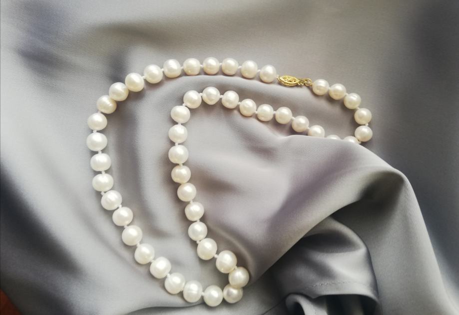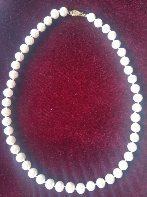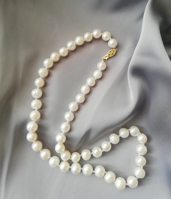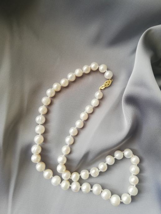 Ogrlica slatkovodnih bisera odlične kvalitete AAA, velike (9 - 10 mm), gotovo okrugle. Zlatarski čvor, pozlaćena kopča.