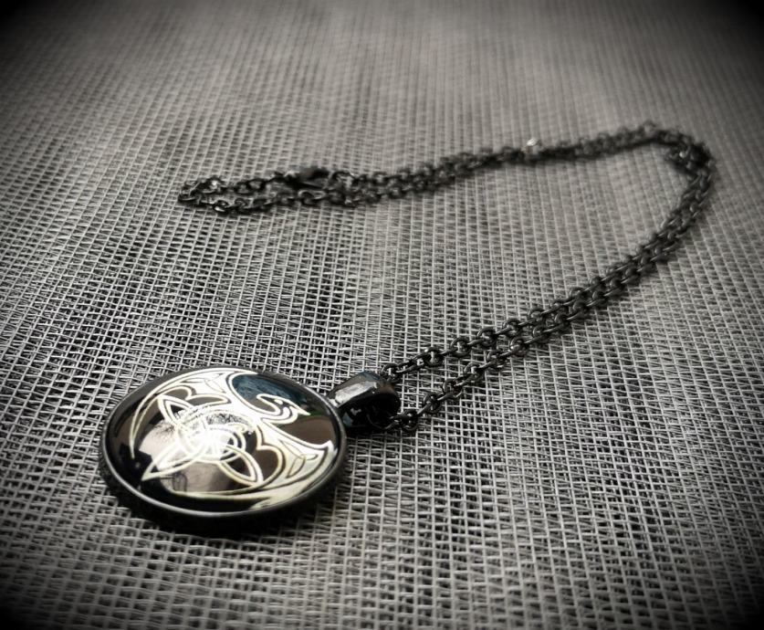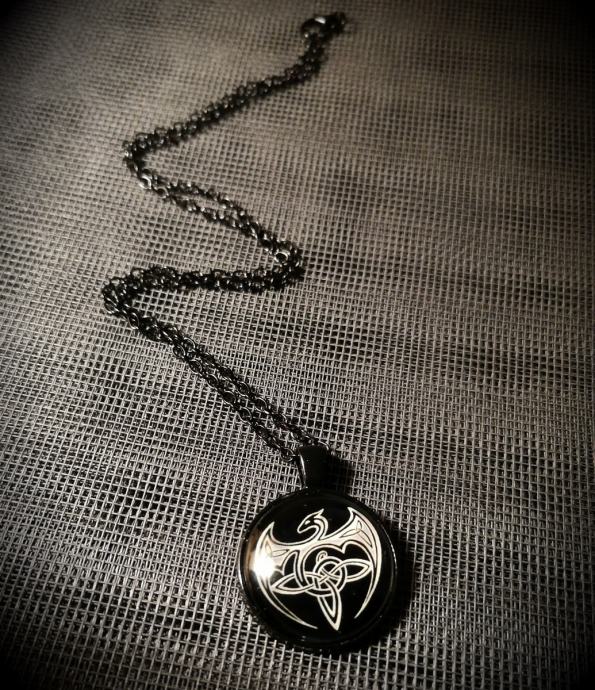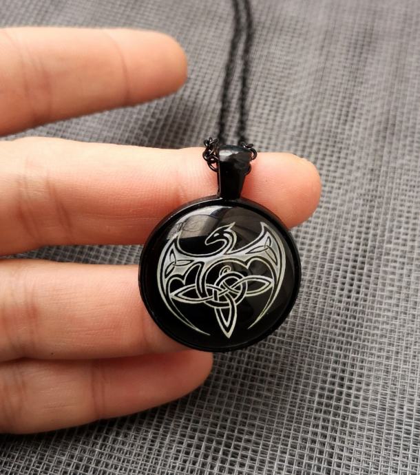 Tijelo zmaja završava završava keltskim čvorom (trinity knot) koji krasi i zmajeva krila, što ogrlici daje i dublje simboličko značenje. Zmaj se sedefasto presijava ovisno o kutu gledanja te pruža živost i dubinu privjesku, a crni okvir i lanac pružaju ogrlici dodatni dašak mistike.