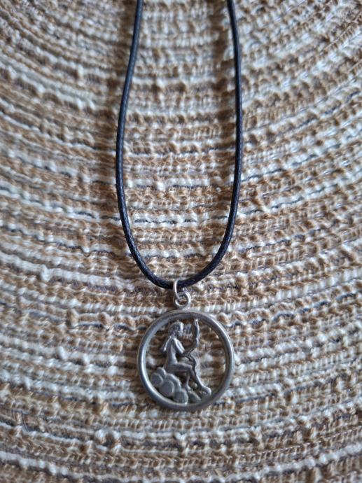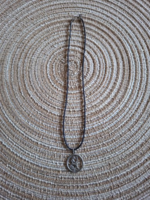 Metalni privjesak na kožici. Kožica moze biti narančasta, zelena ili crna, sve po izboru kupca.