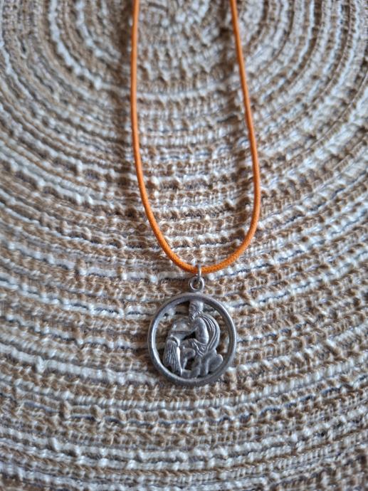 Metalni privjesak na kožici. Kožica moze biti narančasta, zelena ili crna, sve po izboru kupca.