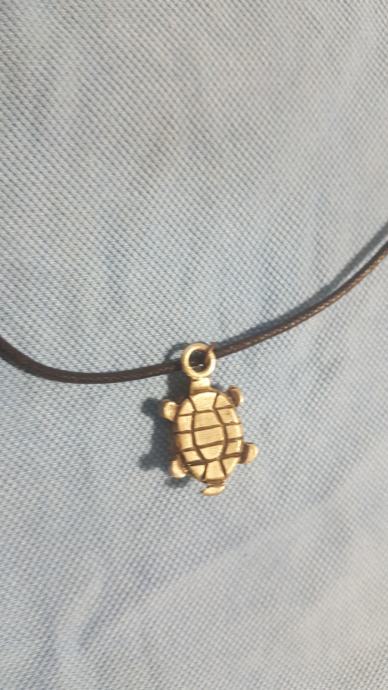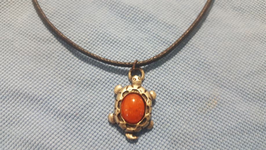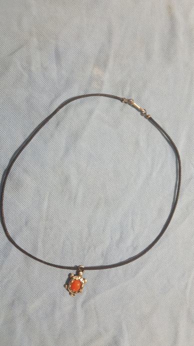 Metalni privjesak na kožici. Kožica moze biti narančasta, zelena ili crna, sve po izboru kupca.