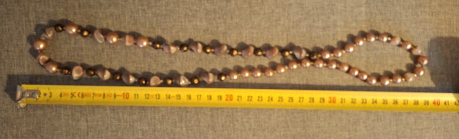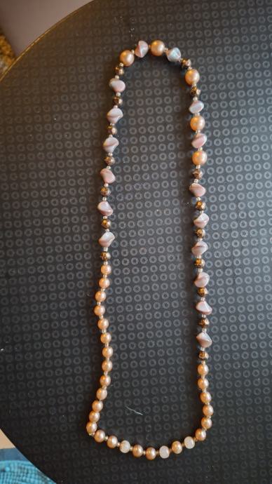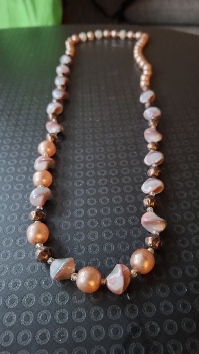 Ogrlicu je izrađena od kombinacije bisernih i smeđih ukrasnih perli. elegantnog je dizajna s naizmjeničnim uzorkom svjetlucavih i mat perli. Odlično očuvana i idealna za svakodnevno nošenje ili posebne prigode.