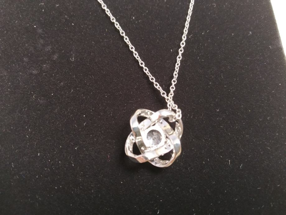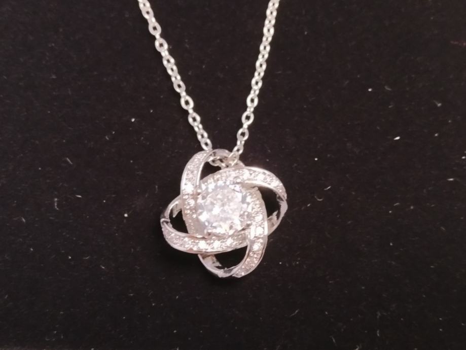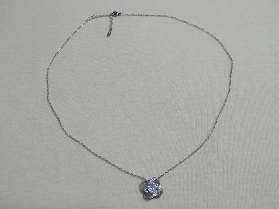 Prodajem prekrasnu ogrlicu od bižuterije s elegantnim privjeskom. Privjesak ima oblik cvijeta s četiri latice koje se isprepliću oko središnjeg dijela ukrašenog bijelim kristalićima. Lančić je fina srebrne boje, a cijela ogrlica djeluje vrlo efektno i profinjenost.