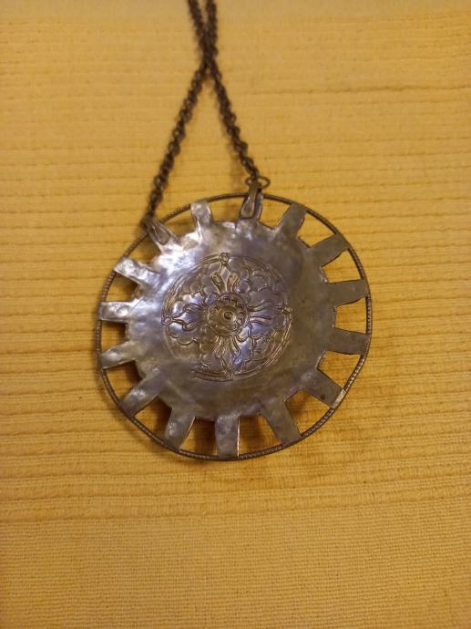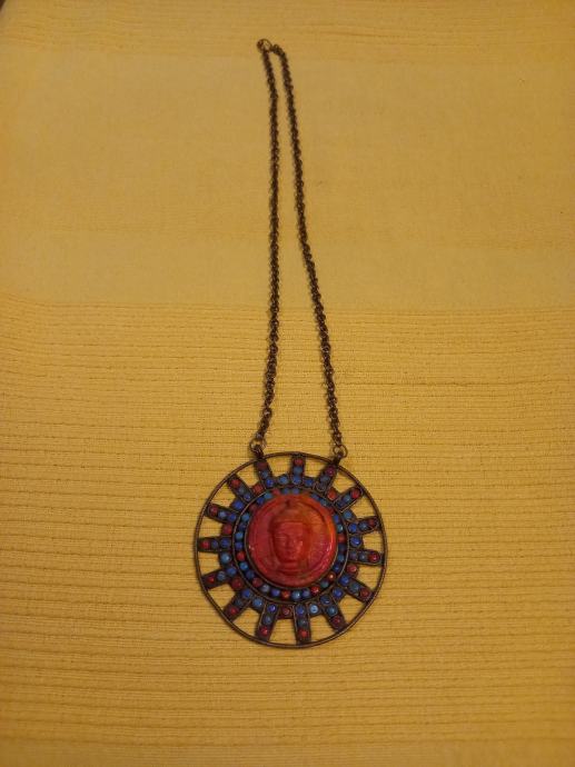 Prodajem zanimljivu ogrlicu od bižuterije s okruglim privjeskom. Privjesak ima dekorativni dizajn s crvenim središnjim dijelom i detaljima u plavim i zlatnim tonovima. Lančić je bronzane boje, jednostavan i elegantan. Ogrlica daje šarmantan vintage dojam.