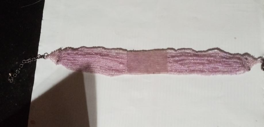 Ogrlica uz vrat od sitnih perlica nježno lila boje.