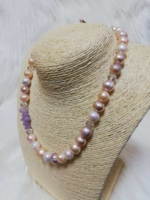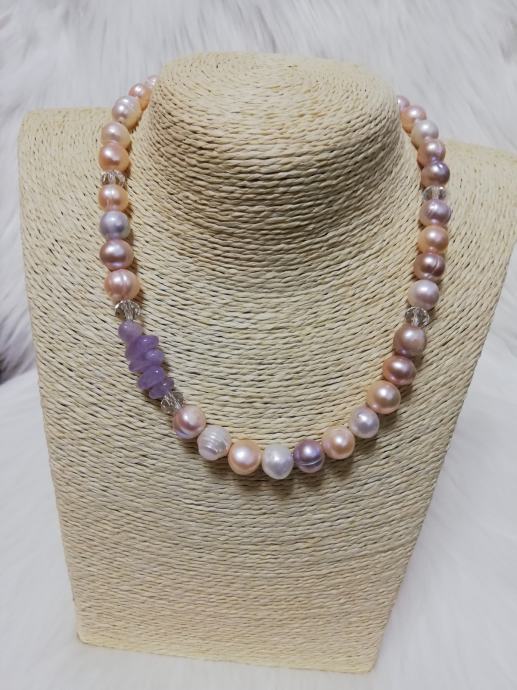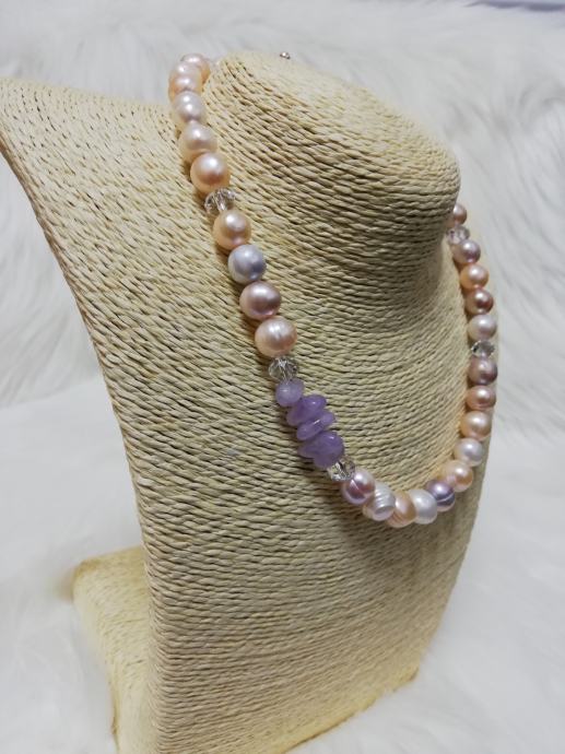 ogrlica od rječnih bisera u nijansama nježno roze, u kombinaciji s poludragim kamenom ametistom,
