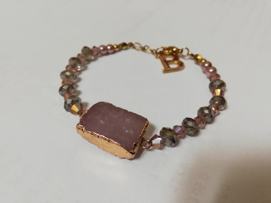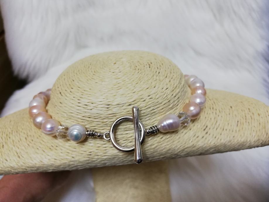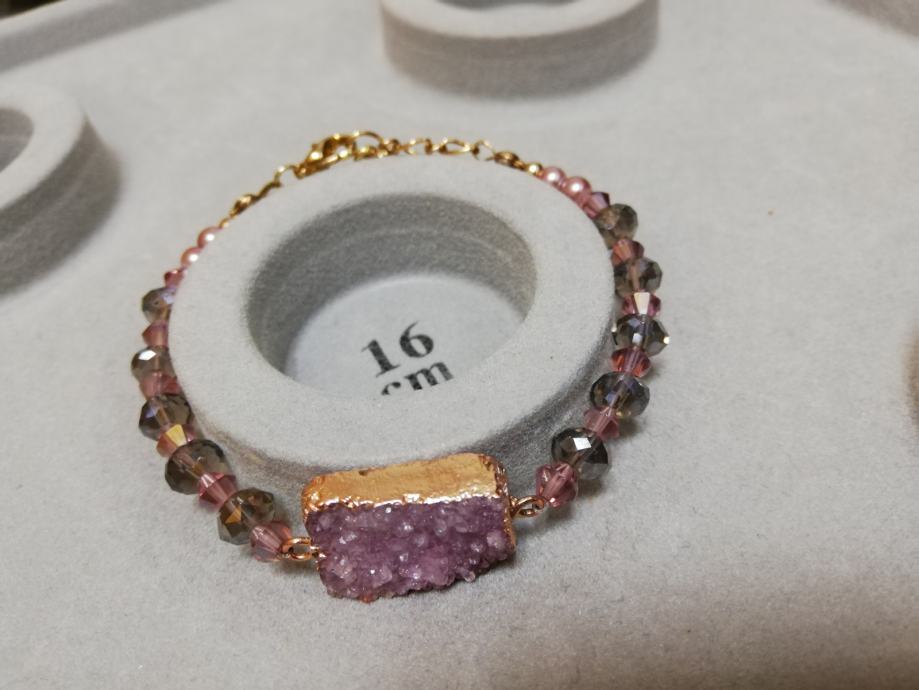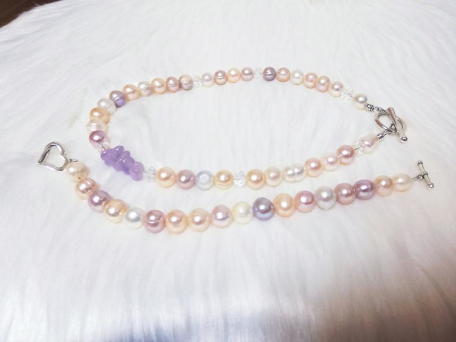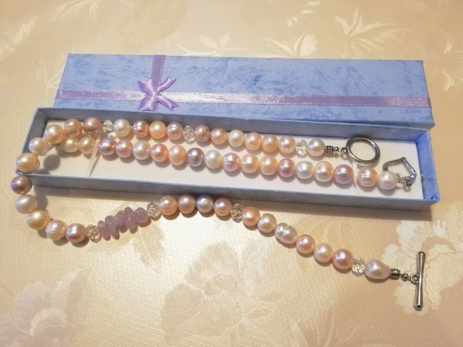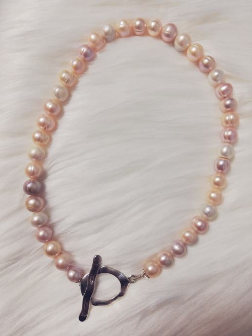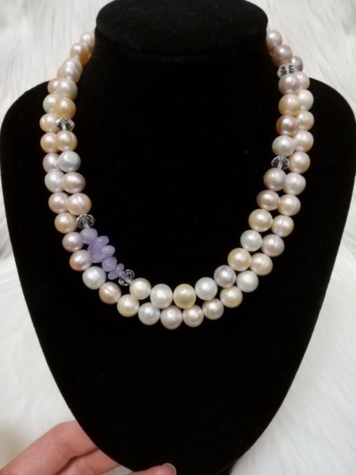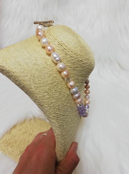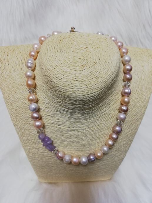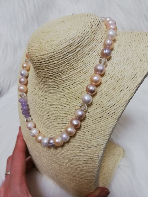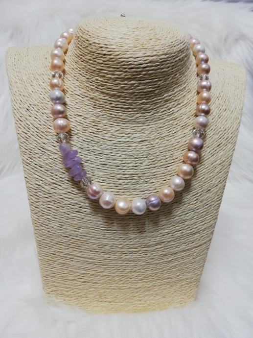 Ametist je postavljen asimetrično pa se ogrlica nosi na više načina (može se zakrenuti po želji) a obzirom da su nijanse bisera od bijele preko roze i krem do lila, sveukupni dojam ogrlice je jedna ujednačena boja. (ametist ne odskače od nijansi oglrice već djeluju kao cjelina)