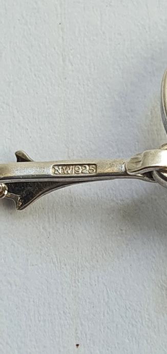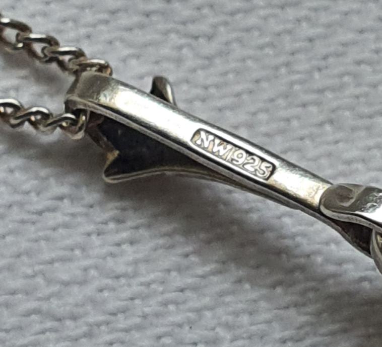 Dužina ogrlice 43,5 cm x 1,5 mm , privjesak ukupna visina sa ukrasnom stilskom alkicom 2,9 cm x 1,9 cm na kojI je i žig, kamenčić je ispupčen i vrhunskog sjaja te lijepog brusa - 2,8 grama - dizajnerski ručni rad oznaka NW 925 nije mi poznato