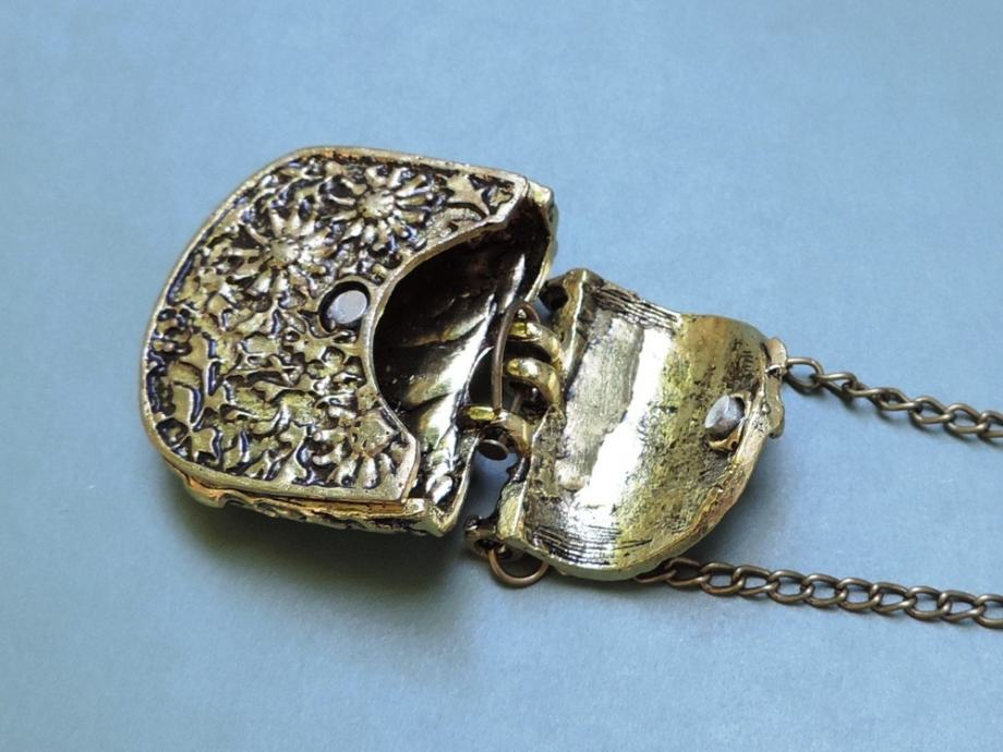 Privjesak je ukrašen lijepim cvjetnim ornamentima, a boja metala je zagasitozlatna (neka vintage zlatna nijansa, na granici zlatne i bakrene).
