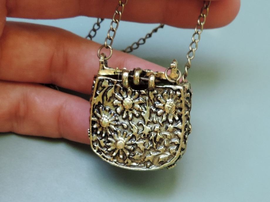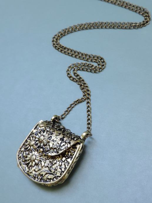 Originalna i preslatka ogrlica koja se sastoji od privjeska u obliku male torbice na dužem lancu.