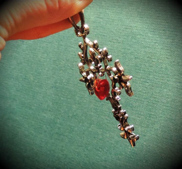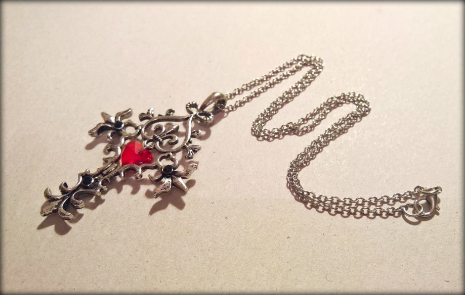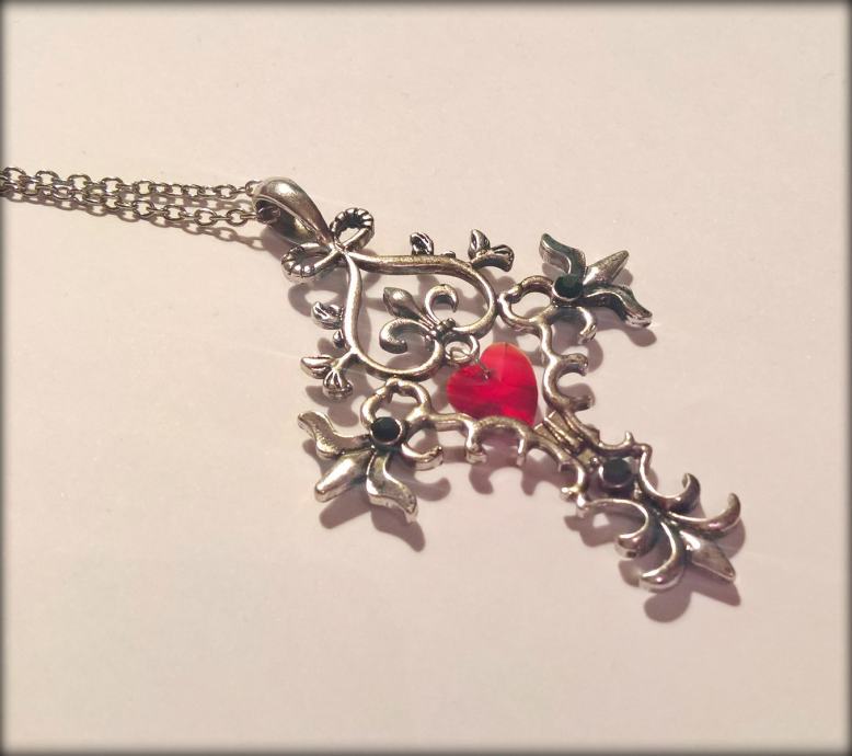 Privjesak čini stilizirani križ, ukrašen lijepim ornamentima i sitnim crnim cirkonima, a u središtu križa nalazi se malo pomično kristalno srce.