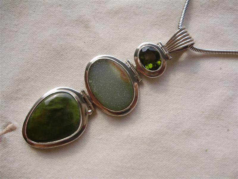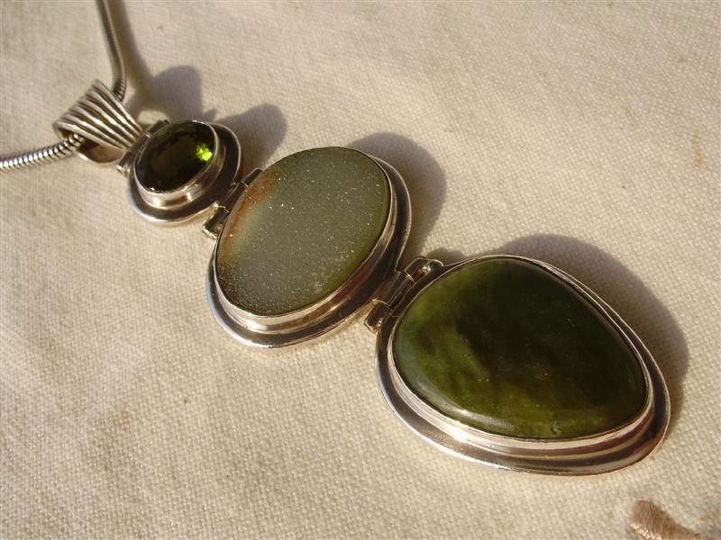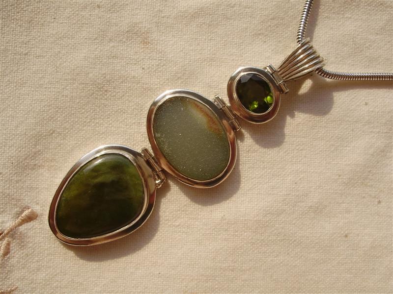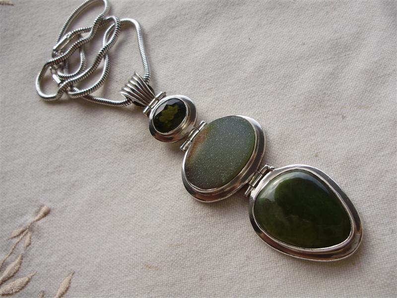 Predivan veliki privjesak na ogrlici sastoji se od velikog kristala zelenog žada, zelenog ahata i fasetiranog peridota.